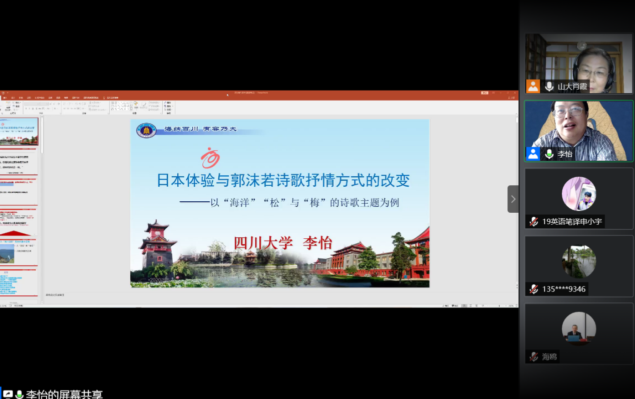 8月6日下午,威廉希尔中文官方网站“九十周年院庆系列活动”——线上学术报告顺利举办。四川大学李怡教授应邀做客学院“博约论坛”,通过腾讯会议线上平台作了题为“日本体验与郭沫若诗歌抒情方式的改变”的学术报告。本次报告由威廉希尔中文官方网站日语系肖霞教授主持,来自威廉希尔中文官方网站和其他高校的150余名师生共同参与聆听。