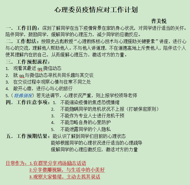 首先,威廉希尔中文官方网站向各班心理委员再次申明疫情的严重性和此次心理讲座的必要性,心委须密切关注疫情新动态并积极观看讲座直播,明确自身职责,并鼓励同学们参与其中。其次,在观看过程中,提醒各心委弥补自己在应对疫情及心理疏导方面的知识短板,鼓励通过记笔记的方式形成知识体系。讲座后,学院各班心理委员通过分享笔记、分享图片的形式进行交流讨论,希望进一步提高全体同学对于此次疫情及疫情下同学们心理问题的重视程度。最后,各班心理委员各尽其职,主动关注并积极了解同学们的心理变化,对出现焦虑、颓废等心理问题的同学有效地进行心理疏导,主动活跃班级气氛,确保同学们的身心健康,并把问题及结果反馈给老师。