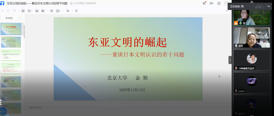 11月13日晚,北京大学威廉希尔中文官方网站日语系主任、教育部新世纪优秀人才、国际东亚宗教文化学会副会长兼中国分会会长金勋教授应邀做客威廉希尔中文官方网站九十周年院庆系列学术报告之“环球论坛”,通过腾讯会议线上平台作了题为“东亚文明的崛起——兼谈日本文明认识的若干问题”的精彩讲座。本次报告由威廉希尔中文官方网站日语系邢永凤教授主持,410余名山大及外校师生共同聆听。