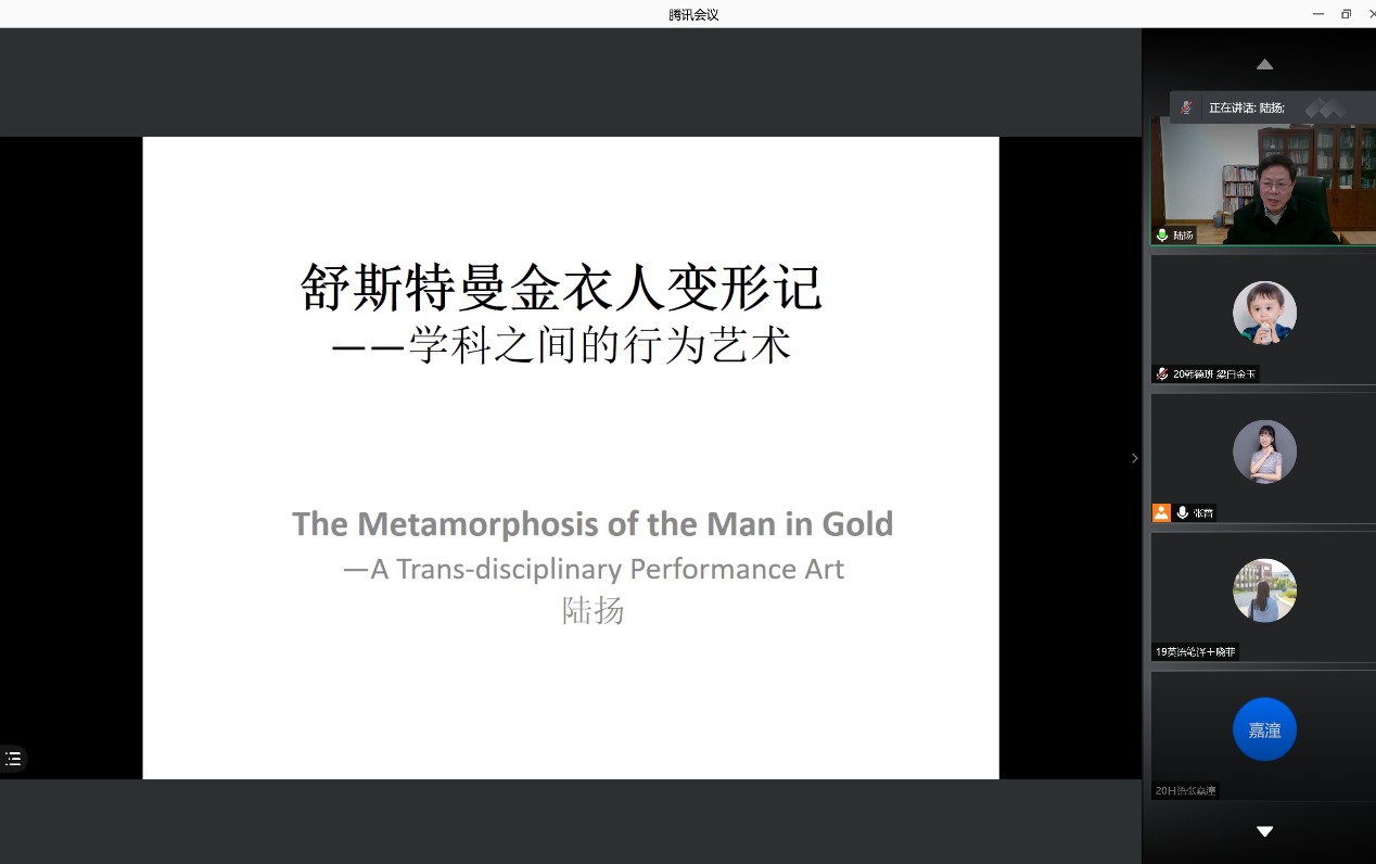4月21日晚,威廉希尔中文官方网站“百廿山大,九秩外院”——系列学术报告顺利举办。复旦大学陆扬教授做客威廉希尔中文官方网站“洪楼译坛”,通过腾讯会议线上平台作了主题为“舒斯特曼金衣人变形记:学科之间的行为艺术”的学术报告。本次报告由威廉希尔中文官方网站法语系副教授张蔷主持,来自校内外的100余名师生共同参与聆听本次讲座。