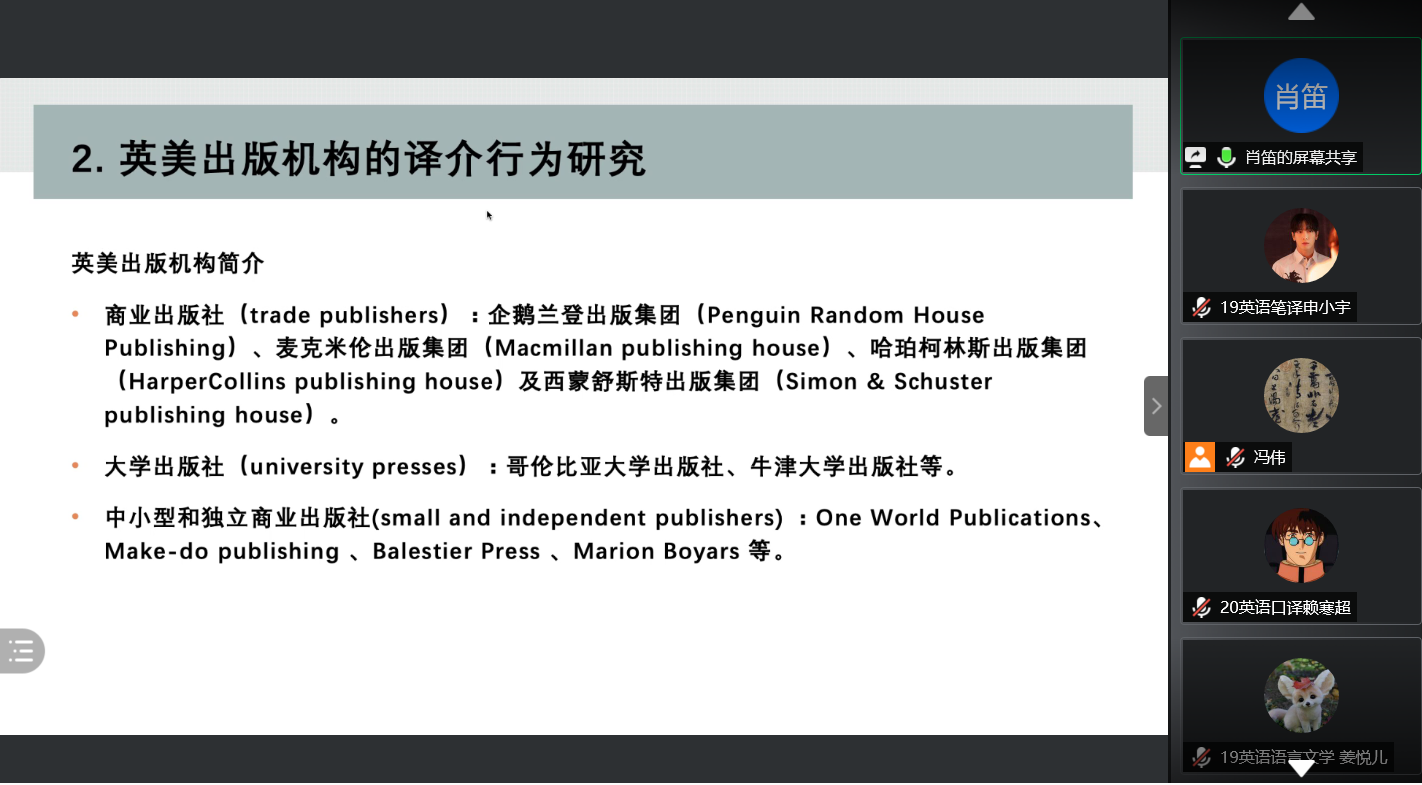 讲座伊始,在对研究背景进行简要介绍之后,肖笛分析了围绕译者行为及译介效果展开的研究。随后,肖笛指出译介机构也是中国文学译介的主要参与者之一。她重点介绍了海外出版机构及媒体对中国文学选择与译介的情况。英美出版机构主要可以分为商业出版社、大学出版社及中小型和独立商业出版社三大类。三者由于性质、出版偏好各不相同,其出版译本的关注度和社会影响力也各有不同。肖笛从不同角度分析了2008年至2018年间中国文学译介所展现出的不同特点。从作家选择来看,出版机构选择的作家数量呈上升趋势且不只局限于主流作家。译介主题仍以严肃文学为主,但不同的出版机构展现出了不同的选择偏好。英美商业出版社对当代小说的主题选择产生了“当代中国”的转向。这种转向对译介文本筛选机制作出要求,即中国地域形象鲜明和批判视角鲜明。读者希望通过阅读文学作品回答社会问题,且这种回答能够不同于讲述中国故事的官方视角。此外,大学出版社、独立及中小型出版社在故事类型的选择上呈现出更加多元化的趋势。接下来,肖笛从副文本视角讲解了译介研究,包括副文本的特点、媒体书评、受到媒体关注的作品所具有的特点等。其中,媒体书评是一种重要的副文本,书评家通过其选择性的推介和个性化的理解和阐释在很大程度上决定了英美读者所能接触到的当代中国小说的范畴,起到了价值引领的作用。同时,书评也使作品功能由文学文本转向社会文本并简化了审美机制。