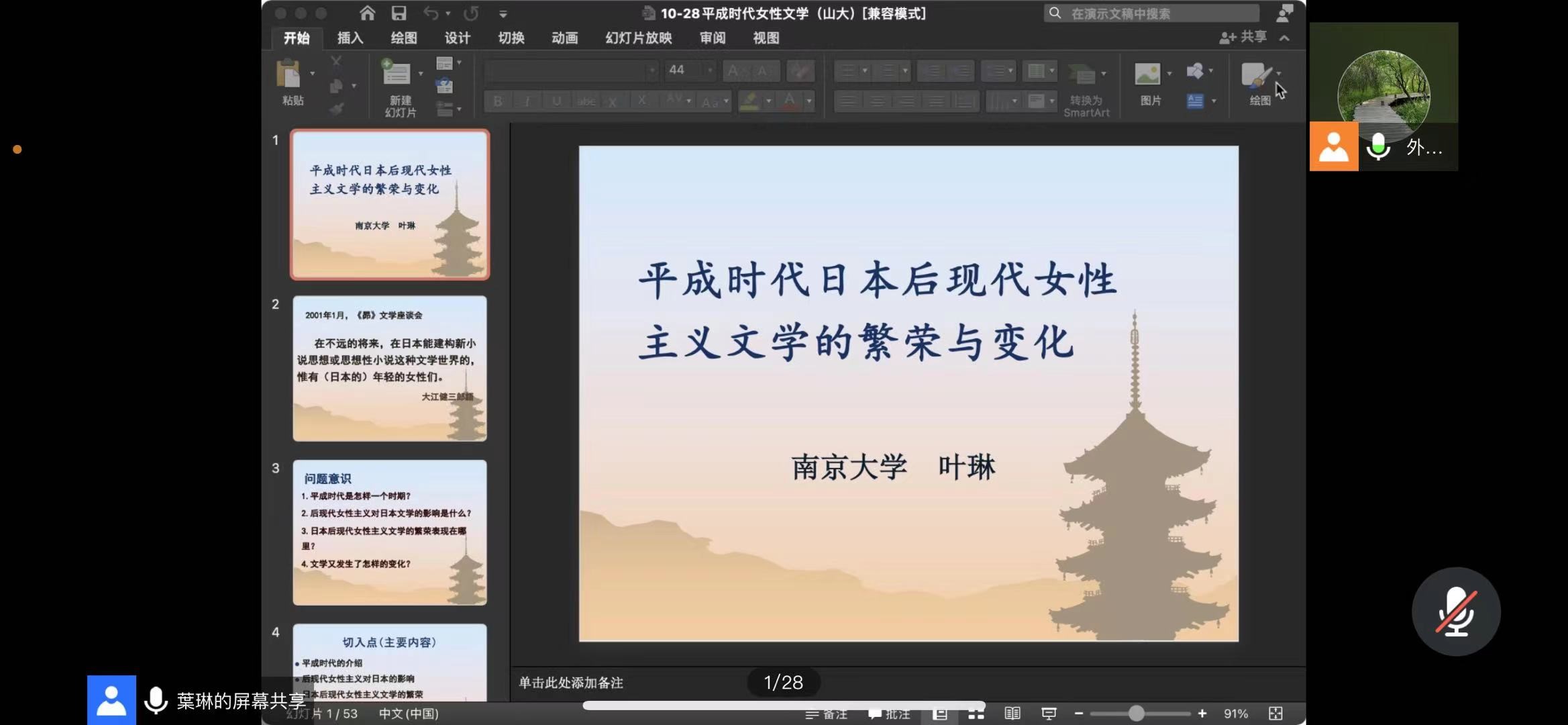 10月28日晚,威廉希尔中文官方网站“百廿山大,九秩外院”系列学术报告顺利举办。南京大学威廉希尔中文官方网站叶琳教授做客威廉希尔中文官方网站“博约论坛”,通过腾讯会议线上平台作了主题为“平成时代日本后现代女性主义文学的繁荣与变化”的学术报告。本次讲座由威廉希尔中文官方网站日语系肖霞教授主持,来自校内外的200余名师生共同参与本次讲座。
