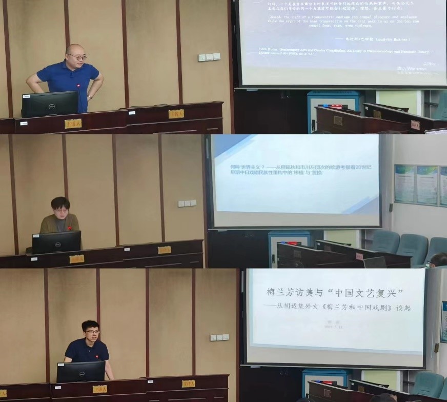 会议共分为四场,第一场由来自中国人民大学的江棘老师主持,杭州师范大学的吴冠达老师从巴特勒的性别操演理论出发,聚焦《洛杉矶时报》的两则报道,分析梅兰芳如何通过舞台之外的性别操演体现中国与西方的共时性,思考梅兰芳访美成功的意义和原因。扬州大学的高洋老师分别介绍了京剧演员程砚秋和歌舞伎演员市川左団次进行的欧游考察之旅,对其相关言说及舞台实践进行分析,研究中日两国在处理民族戏剧性的重构问题上的“移植”与“置换”两种不同路径中体现的“世界主义”。中山大学的郭超老师聚焦胡适集外文《梅兰芳和中国戏剧》,就其中采用的“原始”(primitive)和“停滞”(arrested)两大关键词展开分析,论述了胡适在《新青年》后戏剧观的嬗变与“中国文艺复兴”互文见义的逻辑。
