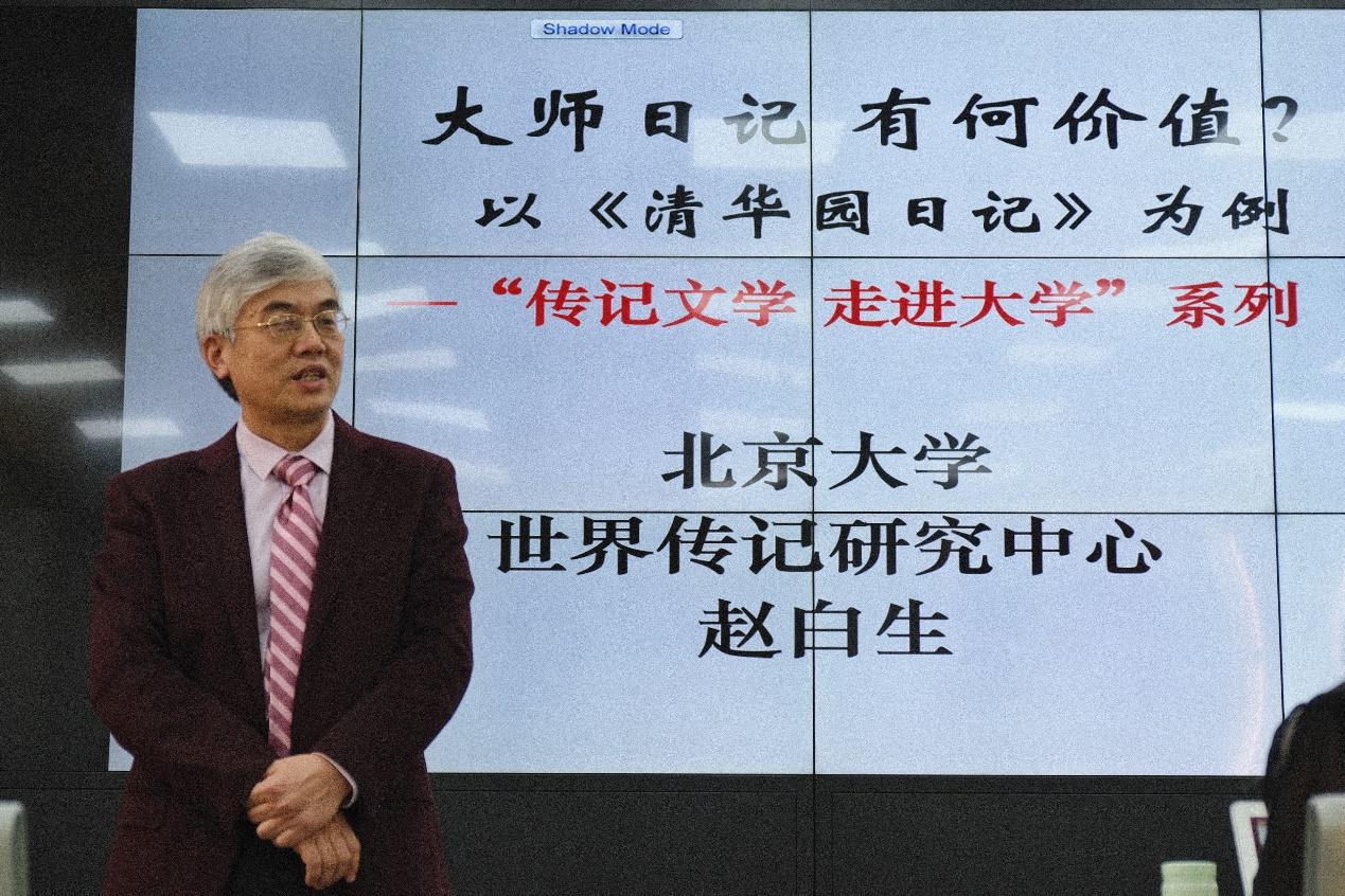 讲座伊始,赵白生为大家展示了传记文学的“家族谱系”,并指出传记文体的研究领域广泛,不应只拘泥于单一范围:从政治人物到勇于为人权发声的青少年,从外国传记作家到国内知名外语系学者,都曾写出销量可观的传记类作品。其中,赵白生强调,外语学者有机会站在“世界的巅峰”,以更宽阔的视野观察中国、观察世界。