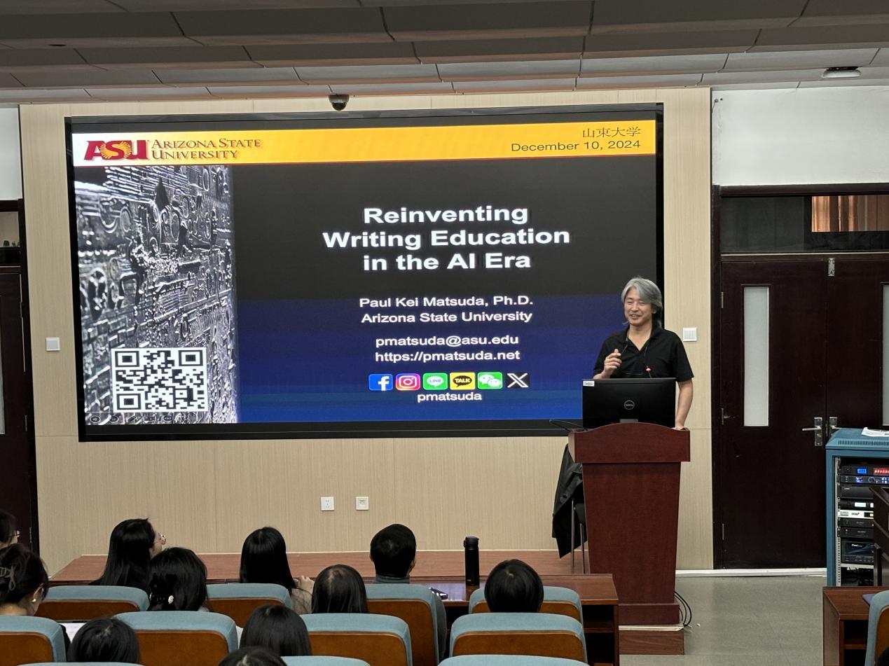 12月10日下午,美国亚利桑那州立大学Paul Kei Matsuda教授应邀做客威廉希尔中文官方网站2024年第14期“知新沙龙”,为学院师生作题为“人工智能时代的写作教学”的学术报告。本次讲座由威廉希尔中文官方网站副院长董记华教授主持。