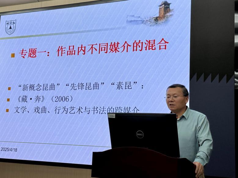 讲座伊始,何成洲从理论框架切入,提出跨媒介性的“两个层次”——作品内跨媒介性与作品外跨媒介性。前者聚焦单一作品内部的媒介混合或指涉,如戏剧中音乐、舞蹈与服装的协同叙事,或小说对音乐节奏的借鉴;后者则关注作品在外部媒介中的延伸,例如经典文本的影视化改编。何教授以实验昆曲《藏·奔》(2006)为例,阐释了其如何通过融合戏曲、行为艺术与书法,突破传统艺术边界,实现跨媒介创新。