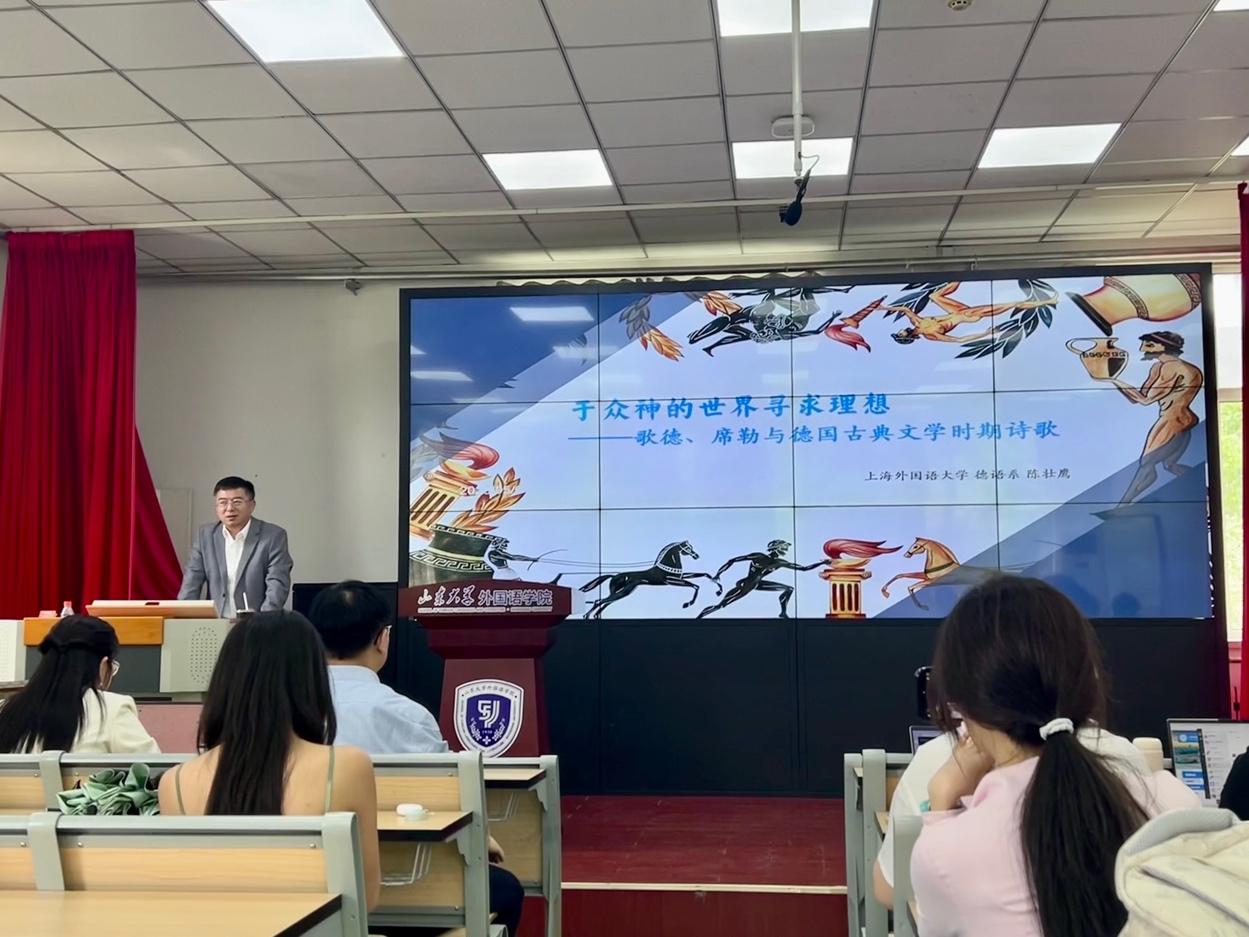 5月12日下午,上海外国语大学研究生院院长、德语系主任陈壮鹰教授做客威廉希尔中文官方网站2025年第3期“文渊论坛”,为学院师生作题为“歌德与席勒:解读德国古典诗歌巅峰”的学术报告。本次讲座由威廉希尔中文官方网站院长马文教授主持,德语系庞娜娜教授、讲师李晓艳等参与学术研讨。