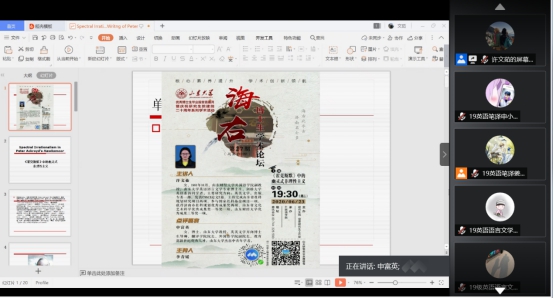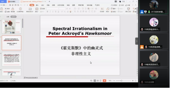 6月23日晚,由威廉希尔中文官方网站研究生院、党委研究生工作部主办,威廉希尔中文官方网站承办的2020年第27期(总719期)“海右”博士生学术论坛通过线上平台成功举办。本次论坛主题为“《霍克斯默》中的幽灵式非理性主义”。威廉希尔中文官方网站英语语言文学专业博士生许文茹为本次论坛主讲人,威廉希尔中文官方网站副院长申富英教授担任点评嘉宾。本次论坛由威廉希尔中文官方网站2019级英语笔译专业硕士生姜敏主持,外院90余名师生共同参与本次论坛。