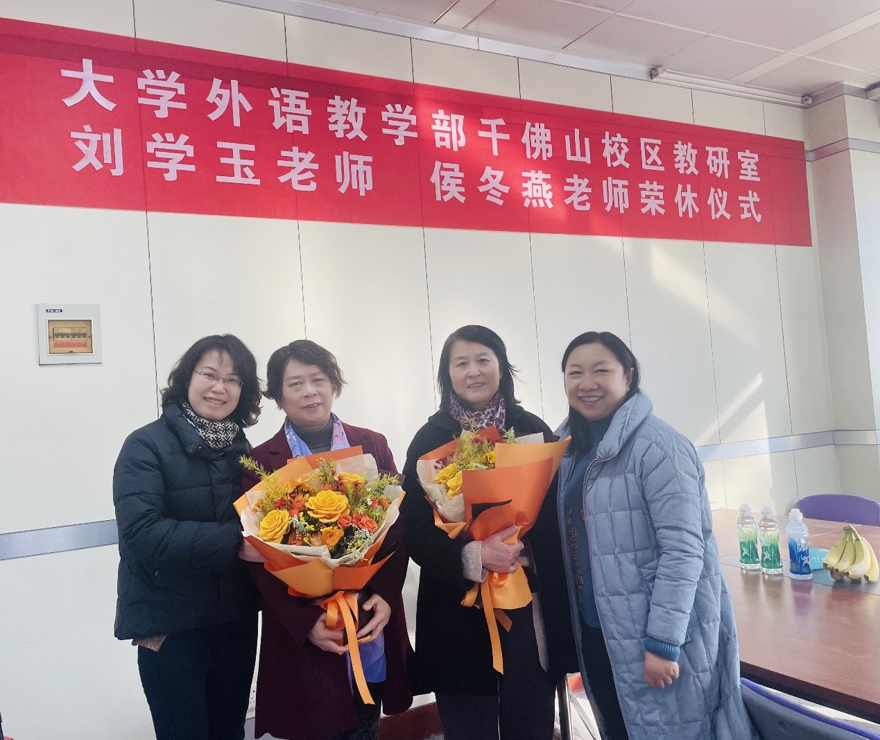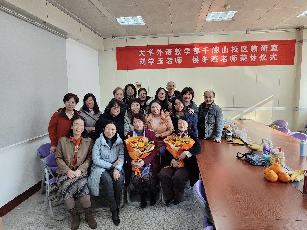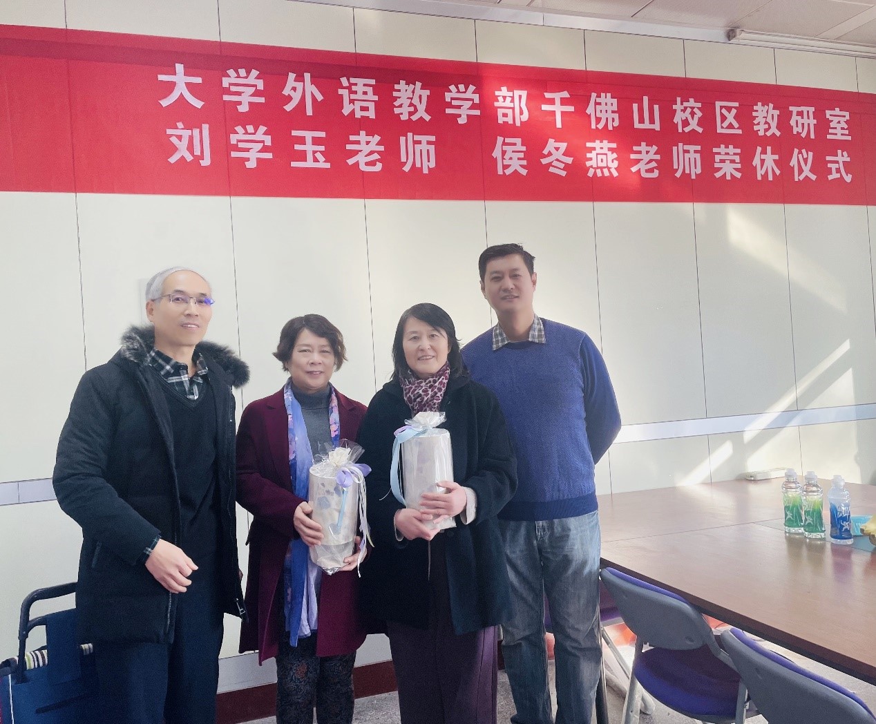 12月26日上午,大学外语教学部千佛山校区教研室举行了一场温馨的荣休仪式,庆祝刘学玉副教授和侯冬燕副教授光荣退休。教研室全体教师齐聚一堂,共同见证了这一感人时刻。仪式由教研室主任许莹主持。