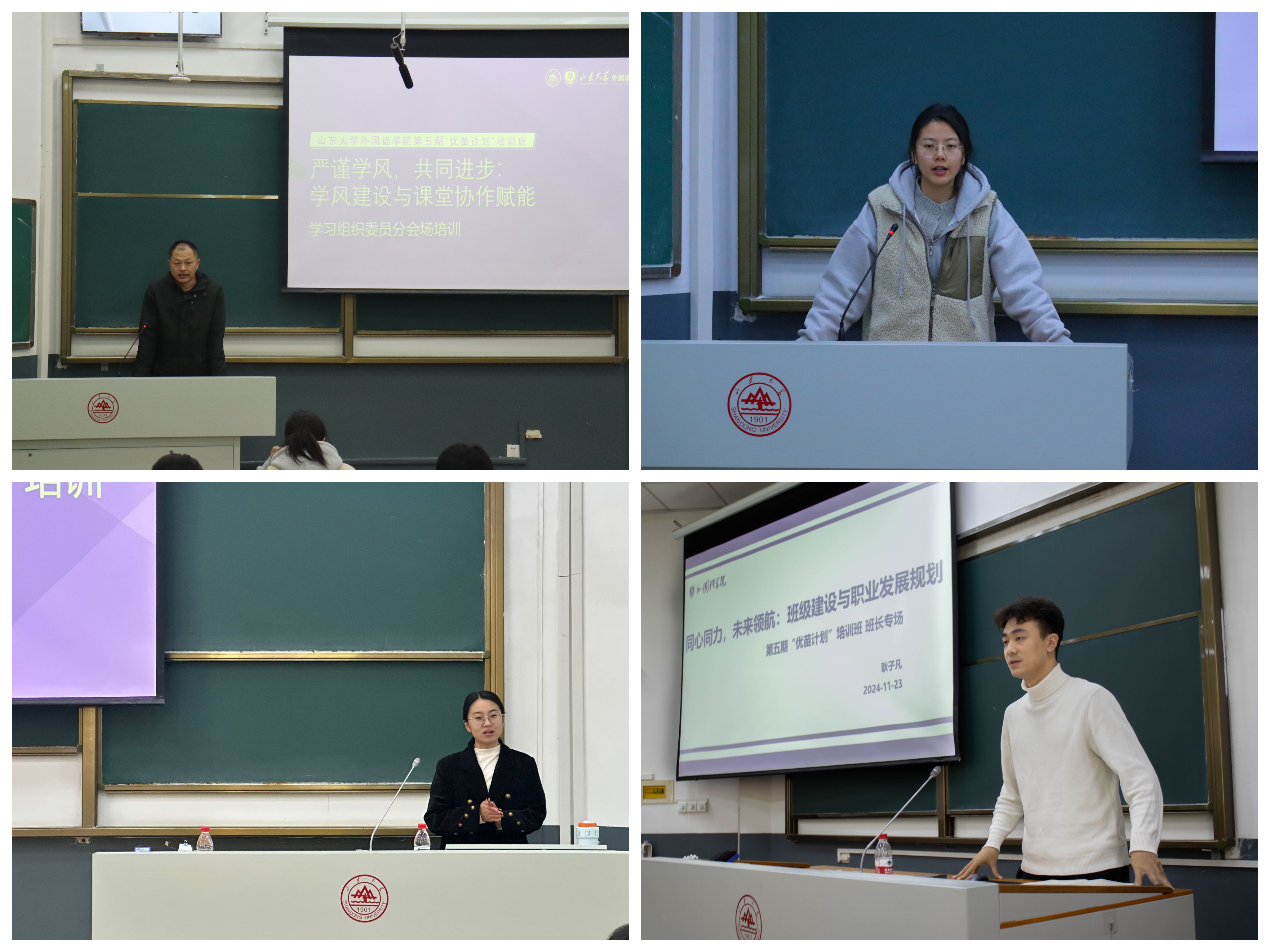 开班仪式后,三个分会场同步开展专题培训。在团支书培训会场,威廉希尔中文官方网站学生心理健康教育与咨询中心孙浩令以“小角色,大能量”为主题,强调了学生干部在学生心理工作中的重要作用,并分享了多种心理工作技巧;2023级辅导员张心慧讲述了团支部在组织建设、校园文化、社会实践、志愿服务、团学宣传等方面如何开展工作。在组织委员培训会场,教务科刘斌详细解答了同学们专业学习方面的问题困扰,并提出有效建议;2021级辅导员陈诺讲述了学院奖助勤贷工作的细节要点,强调了学习委员在班级 “学风建设”中的重要作用。在班长培训会场,2024级辅导员耿子凡结合年级特点,指出了各年级班级管理工作的要点,明晰了班级工作开展方向。各分会场优秀班委代表结合自身经历分享了工作经验与感悟,解答同学疑问,帮助新任班委构建班级工作全景认知。