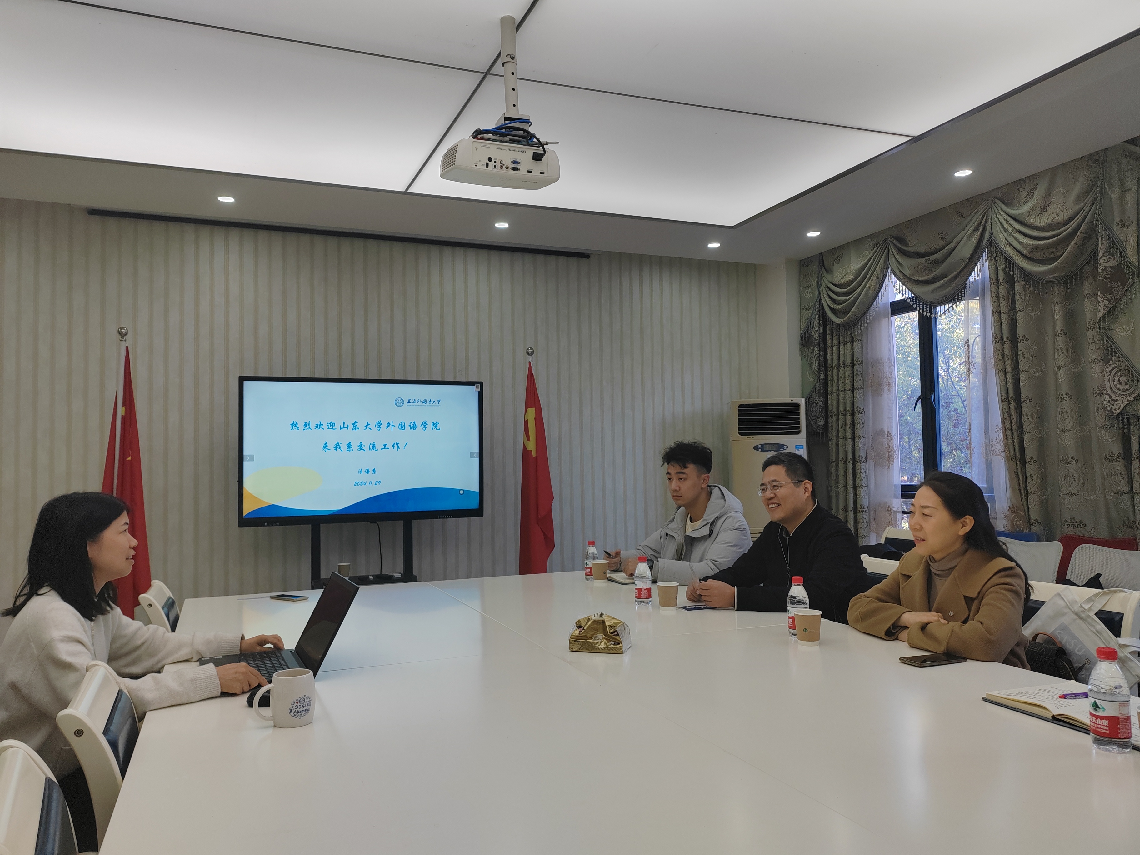随后,学工团队一行与华东师范大学外语学院展开交流调研。会前,在外语学院党委副书记兼副院长武娟的带领下,与会人员参观了外语学院文化墙。魏鲁鸿介绍了学院的基本情况,他提到,近年来学院紧紧围绕立德树人根本任务,在心理育人、生涯规划、就业服务、特色活动等方面展开积极探索,着力推动学生工作高质量发展。华东师范大学外语学院辅导员依次就学院心理健康教育工作模式与守护体系、二级心理辅导站建设、国际交流、就业促进等方面工作的具体做法和经验进行分享。双方表示将以此次交流为契机,积极开展合作,为培养更多优秀人才而努力。