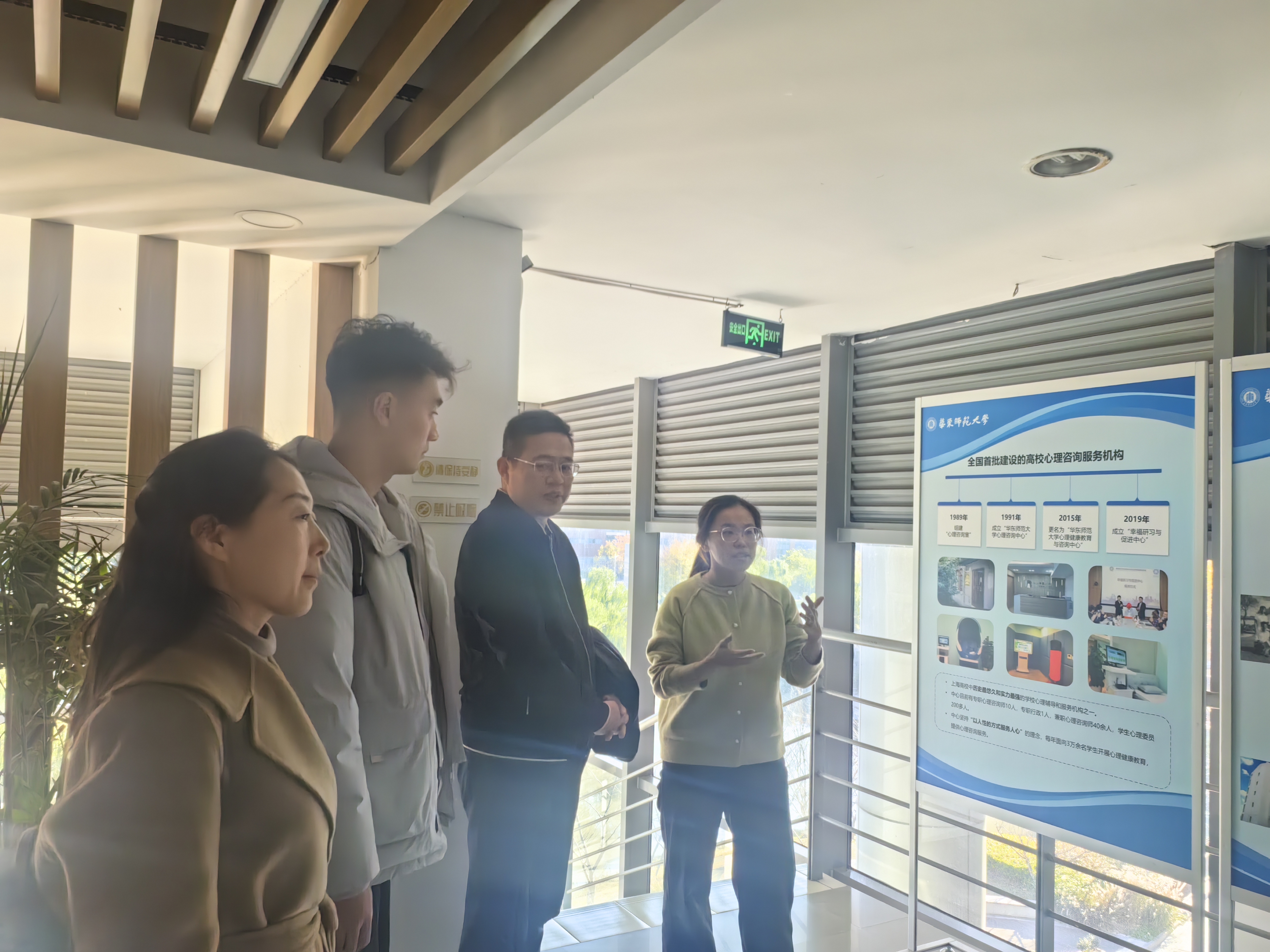 下午,学工团队一行参观了华东师范大学心理健康教育与咨询中心,深入了解了心理中心场地设备的建设与使用情况、大学生心理健康教育工作的开展模式与亮点特色。