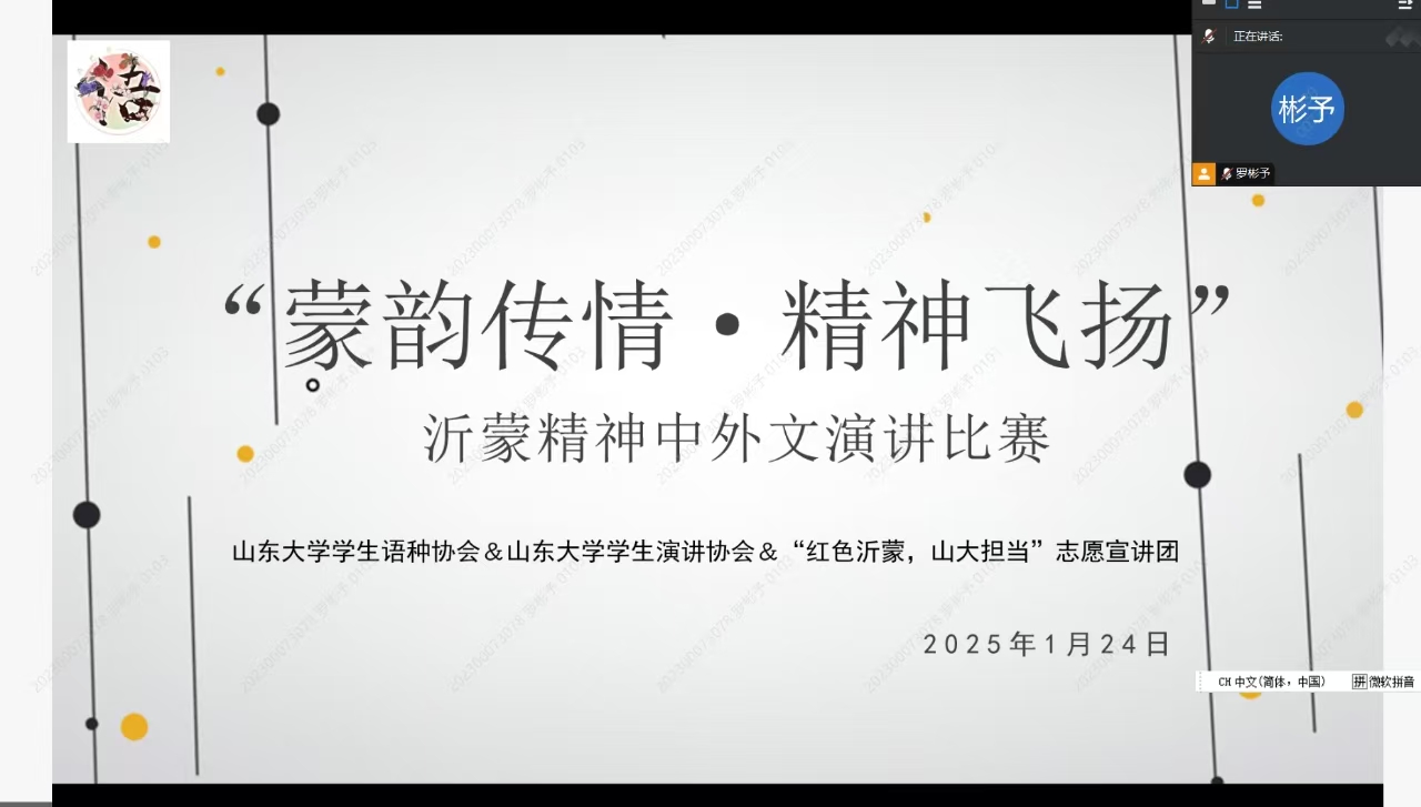 一曲《沂蒙颂》,道尽沂蒙精神的赤诚。为传承沂蒙精神,阐释红色文化于当代社会的深远价值,推动先进革命文化走向世界,威廉希尔中文官方网站语种协会,沂蒙精神宣讲团与威廉希尔中文官方网站演讲协会于1月24日线上共同举办“蒙韵传情·精神飞扬”沂蒙精神中外文演讲比赛,这不仅是一场语言的竞技,更是一场对红色精神的溯源,对团结奋斗基因的传承。