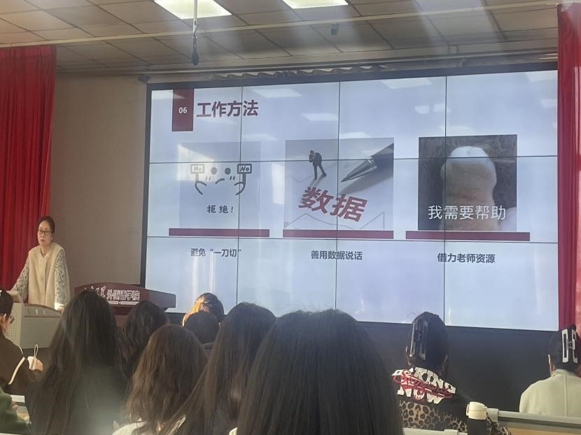 朱蕾围绕工作方法与能力提升两大主题进行了深入指导,强调学生骨干在日常管理中应避免“一刀切”,注重科学决策,善用数据支撑工作,同时要积极借力教师资源,凝聚育人合力。同时指出,学生骨干需全面提升执行力、创新力、共情力和抗压力,从高效完成任务、突破常规思维、理解同学需求到妥善应对复杂问题,逐步实现从“被动执行者”向“主动管理者”的转变,为班级建设和同学成长提供坚实保障。