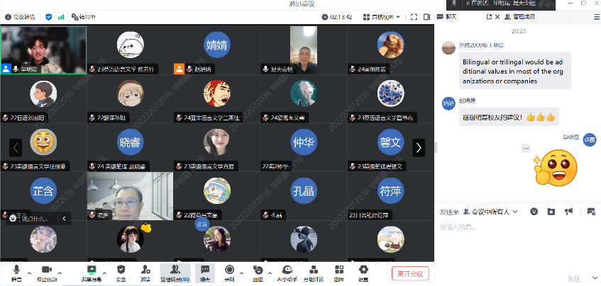 3月2日,威廉希尔中文官方网站第七期“山外”校友会客厅以线上方式成功举办。本次活动以“外语人的国际组织职业转型实战录”为主题,特邀国际劳工组织亚太局项目经理、2000级英语专业校友凌胜担任主讲嘉宾,与师生校友共话国际组织职业发展路径。学院党委副书记魏鲁鸿、2022级本科生党支部书记赵婧婧以及学院本研学生近100人参加活动,2022级本科生毕明磊主持。