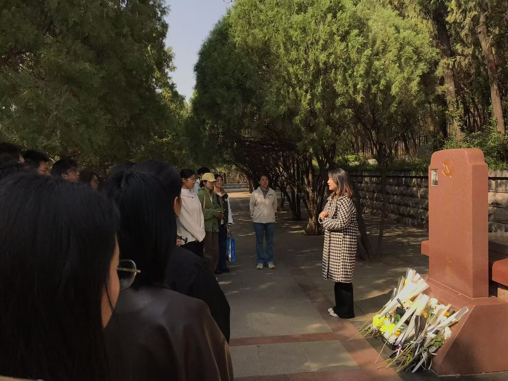 随后,同学们有序步入烈士陵园,瞻仰革命烈士陵墓。在无名烈士墓前,同学们依次敬献花束,表达对英雄的无限敬意。在王尽美、邓恩铭等革命烈士的墓碑前,同学们聆听了先烈们的英雄事迹,并为其不惧牺牲、英勇奉献的大无畏精神而深受感动。付娜同学作为代表发表感言,表示要铭记革命先辈的英勇事迹,在新时代新征程中勇于担当、甘于奉献,为国家繁荣与民族复兴贡献自己的青春力量。