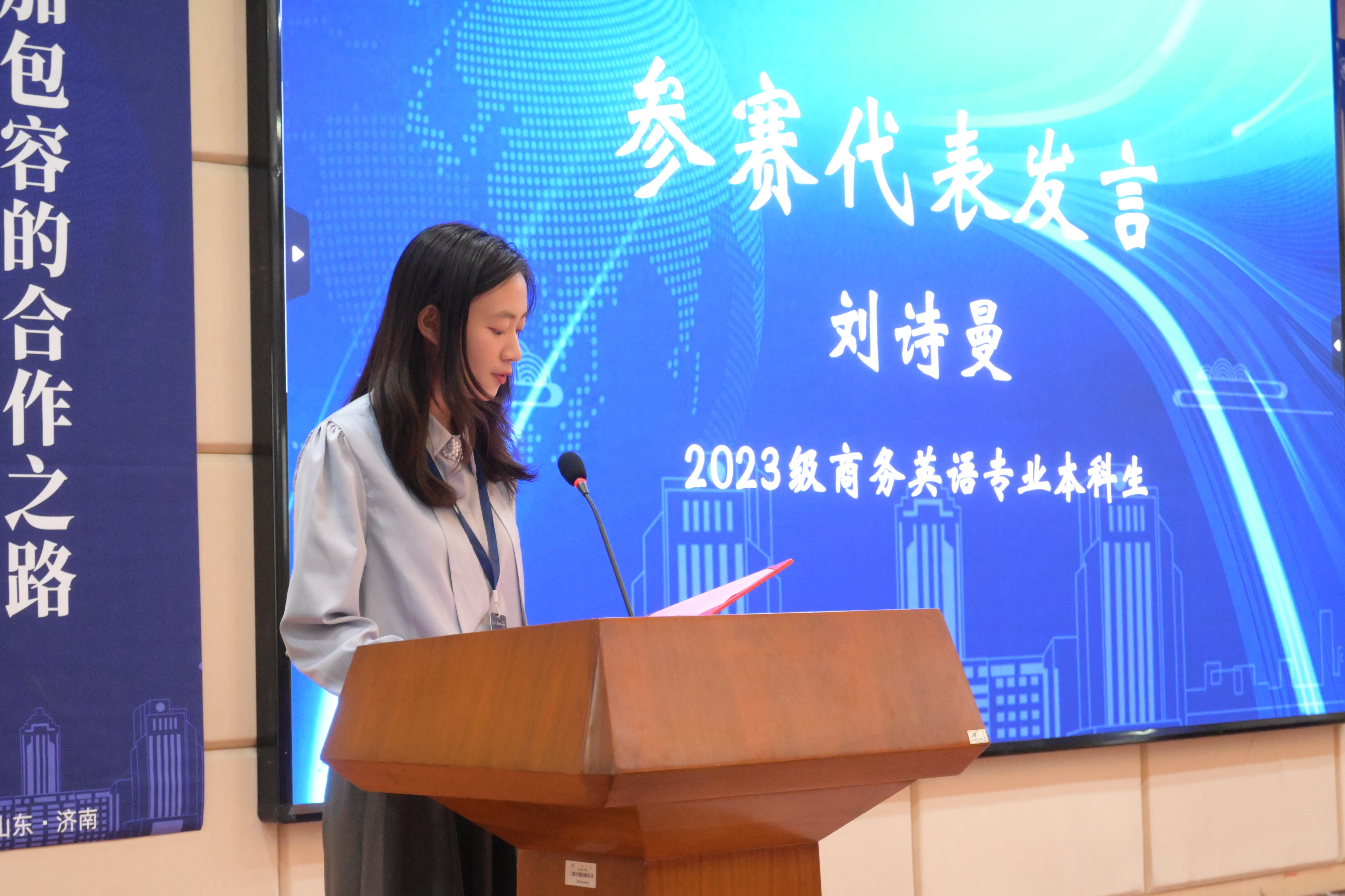 大会秘书长2023级国际组织与全球治理专业本科生王信淳代表大赛组委致辞,希望各位代表秉持包容性合作理念,展现中国青年在全球治理中的创新智慧与责任担当。2023级商务英语专业本科生刘诗曼作为参赛代表发言,呼吁同学们以开放心态学习全球治理的前沿议题,在模拟谈判中锤炼国际视野与协作能力,用创新思维为包容性增长赋能。