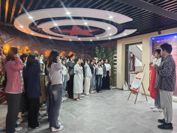 在章丘第一支抗日武装纪念馆,同学们聆听了章丘人民可歌可泣的抗战往事,并为革命先辈们碧血丹心的卫国情怀深深感动。在英雄伟迹的感召下,同学们进一步筑牢了信仰根基,补足了精神之钙,内心的红色火种也在此刻愈燃愈烈。在党旗前,同学们重温了入党誓词,信念与使命感得到了进一步增强。