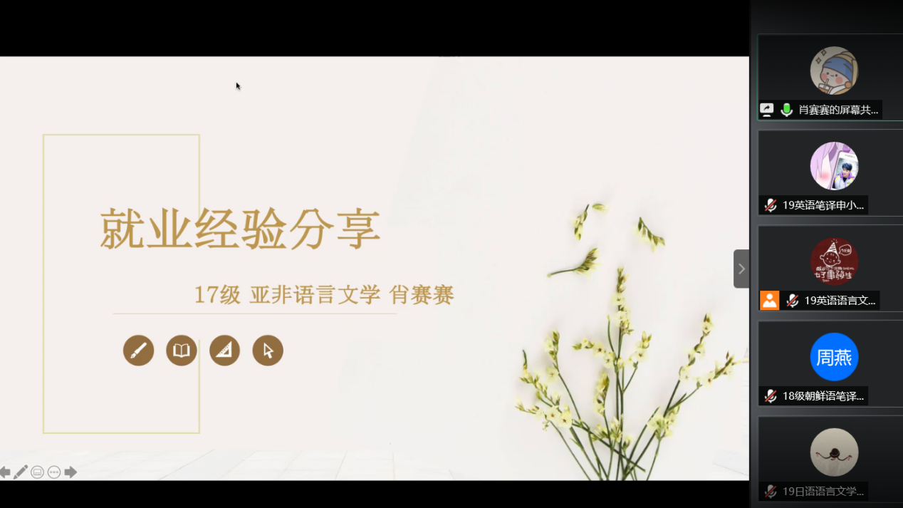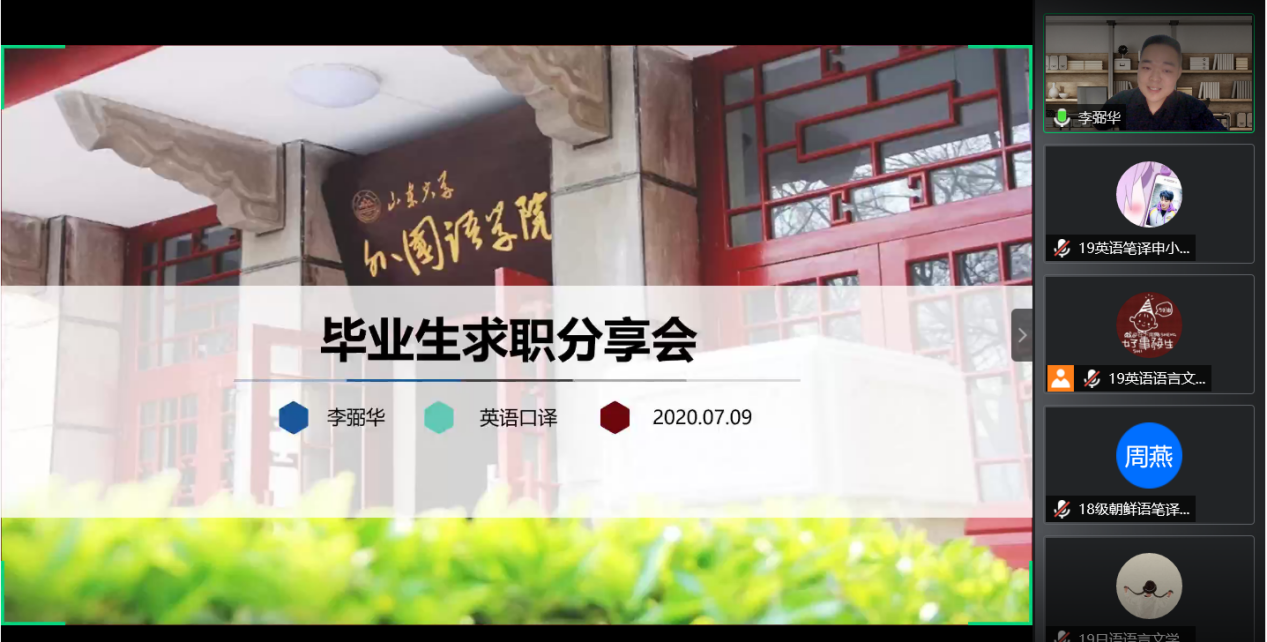 7月9日晚,威廉希尔中文官方网站研究生会实践部借助线上平台成功举办优秀毕业生求职经验分享会。本次分享会,邀请到了四位优秀的硕士毕业生为大家分享他们的求职经验,他们分别是2017级英语口译专业硕士研究生李弼华、2017级亚非语言文学专业硕士研究生肖赛赛、2017级日语语言文学专业硕士研究生伍雨倩、2017级英语笔译专业硕士研究生张博。众多外院学子参与了本次分享会。