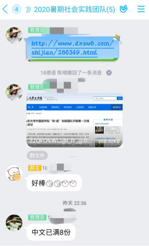 紧接着,实践团成员就今日成果进行系统的汇报。校外媒体新闻稿负责人陈晴就发表在大学生网报上的新闻稿进行说明并传授相关经验,成员孙旸就今日专家问卷回收进行说明并提出看法,其余成员就今日疫情研究论文进行简要概括并总结相关经验。