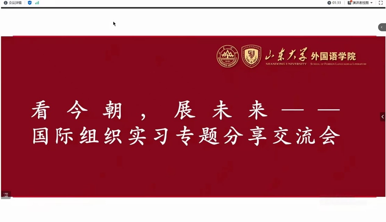 “看今朝·展未来——国际组织实习专题分享交流会”顺利举办。学院邀请了拥有国际组织实习经验的学生担任嘉宾,分享他们的实习心得、求职策略、以及留任发展等关键信息,旨在为同学们拓宽实习和就业视野,启迪职业发展新思路。
