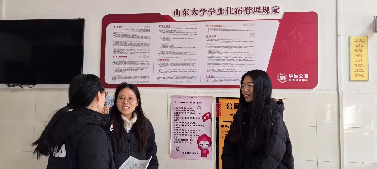 寒假期间,学院党委副书记马蕾和辅导员张新苑、刘婷婷深入留校学生宿舍,开展暖心走访活动。她们带着诚挚的问候,仔细询问留校学生的生活状况与学习计划,为学生送上贴心的关怀。在走访过程中,不仅关心学生的饮食起居,还鼓励学生合理安排假期时间,保持良好的学习与生活节奏。同时,着重强调宿舍安全问题,详细检查宿舍用电设施、消防器材等,提醒学生严禁使用违规电器,确保宿舍安全无隐患,让留校学生在寒冬中感受到学院大家庭的温暖与关爱。