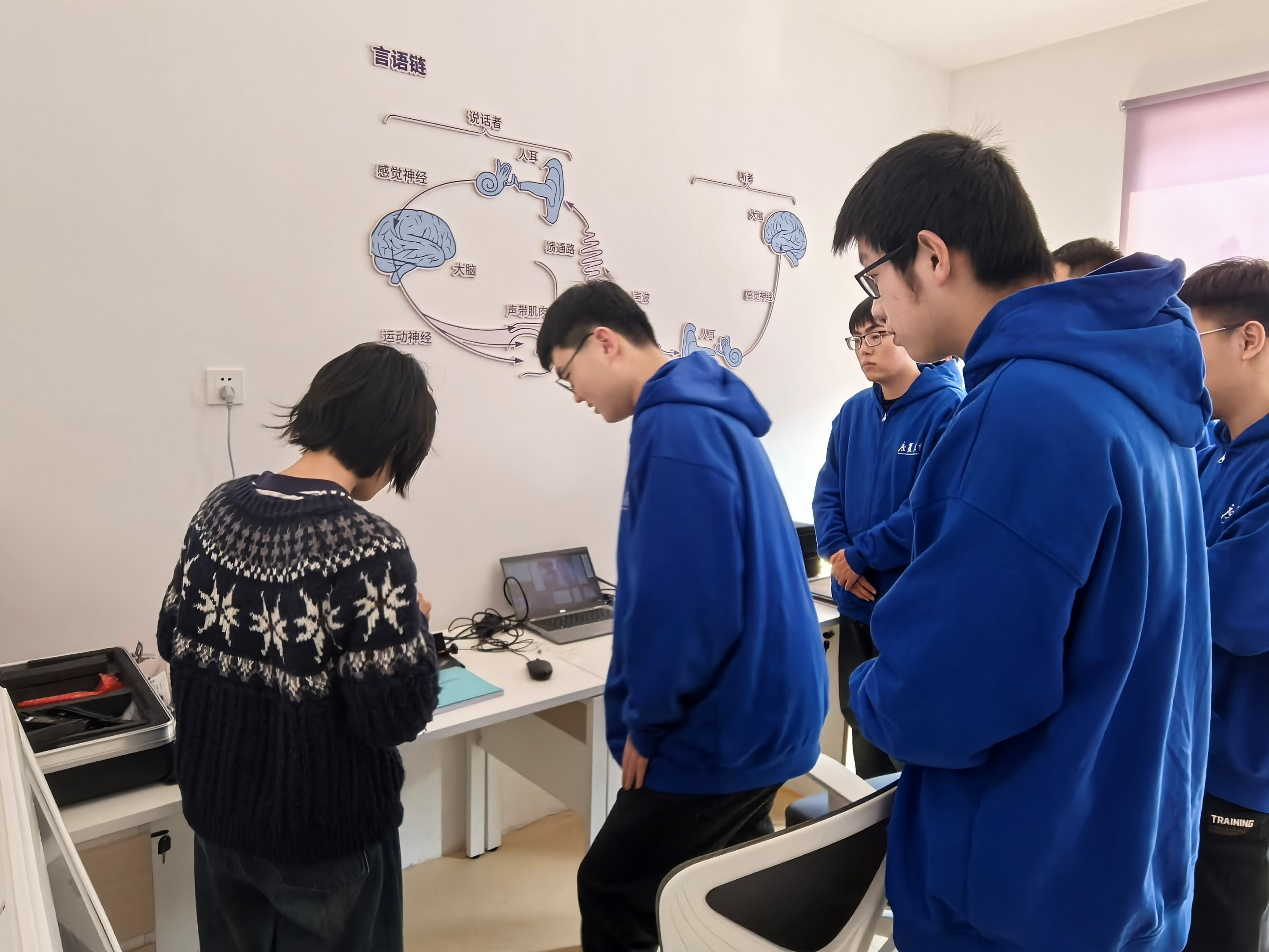 外国语言学与应用语言学专业的同学们讲解了基地康复训练区、高级实验区和技术研发区的功能,以及对孤独症儿童、抑郁症患者、阿尔兹海默病老年人等群体,如何开展语言认知功能的评估与康复。