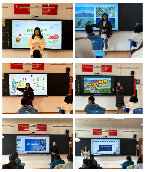 志愿者们结合专业特长,为同学们讲解了英国、韩国、法国、澳大利亚、泰国等国家的风土人情、传统服饰、节日庆典、特色美食和经典建筑等。志愿者们运用图片、视频、音乐等多种形式,结合生动的语言和肢体动作,营造轻松愉快的学习氛围,帮助同学们更直观地感受异国文化。在互动过程中,志愿者们精心设计了趣味十足的体验活动,邀请学生同台进行魔术表演,教室里充满欢笑和掌声。