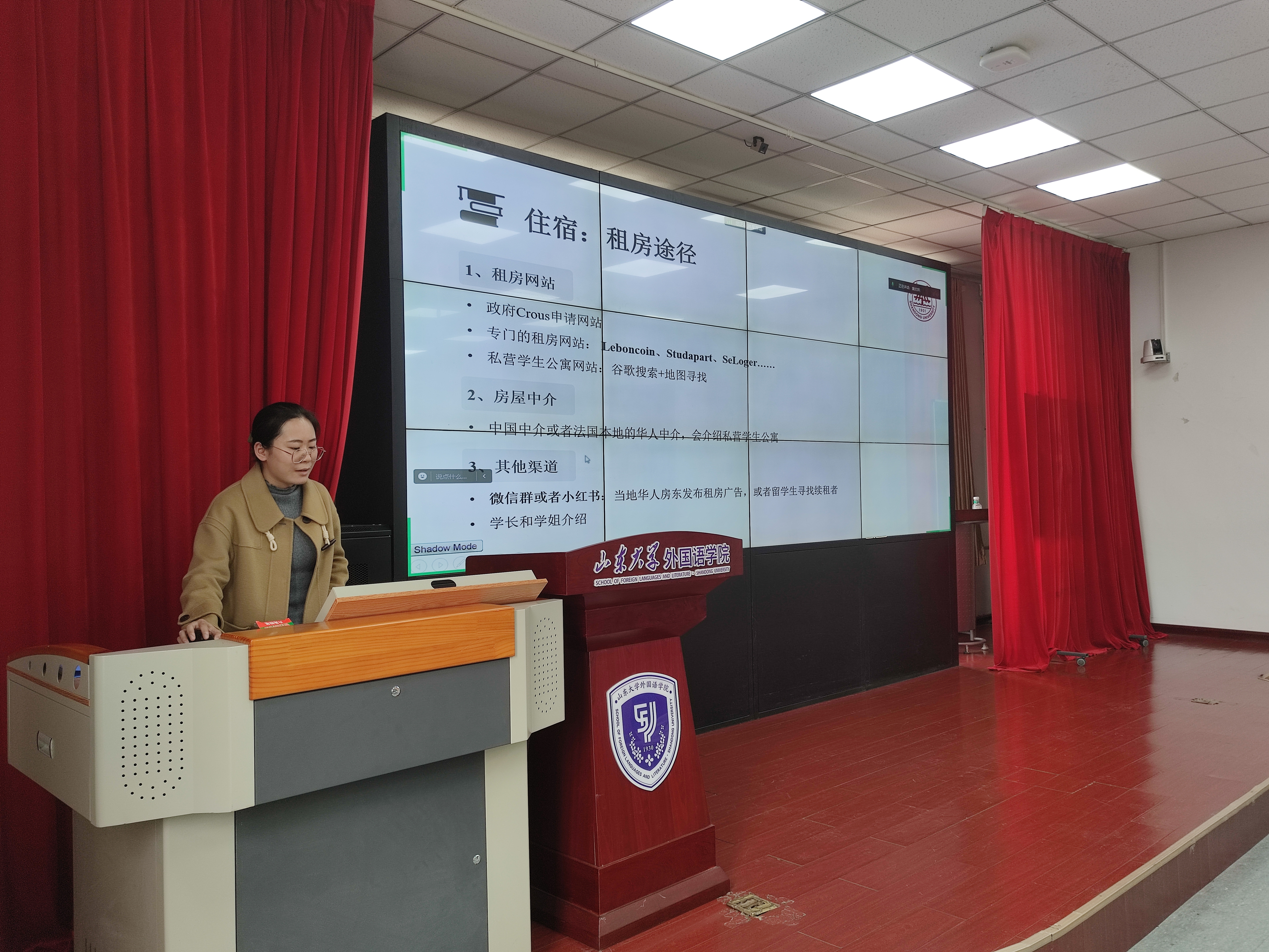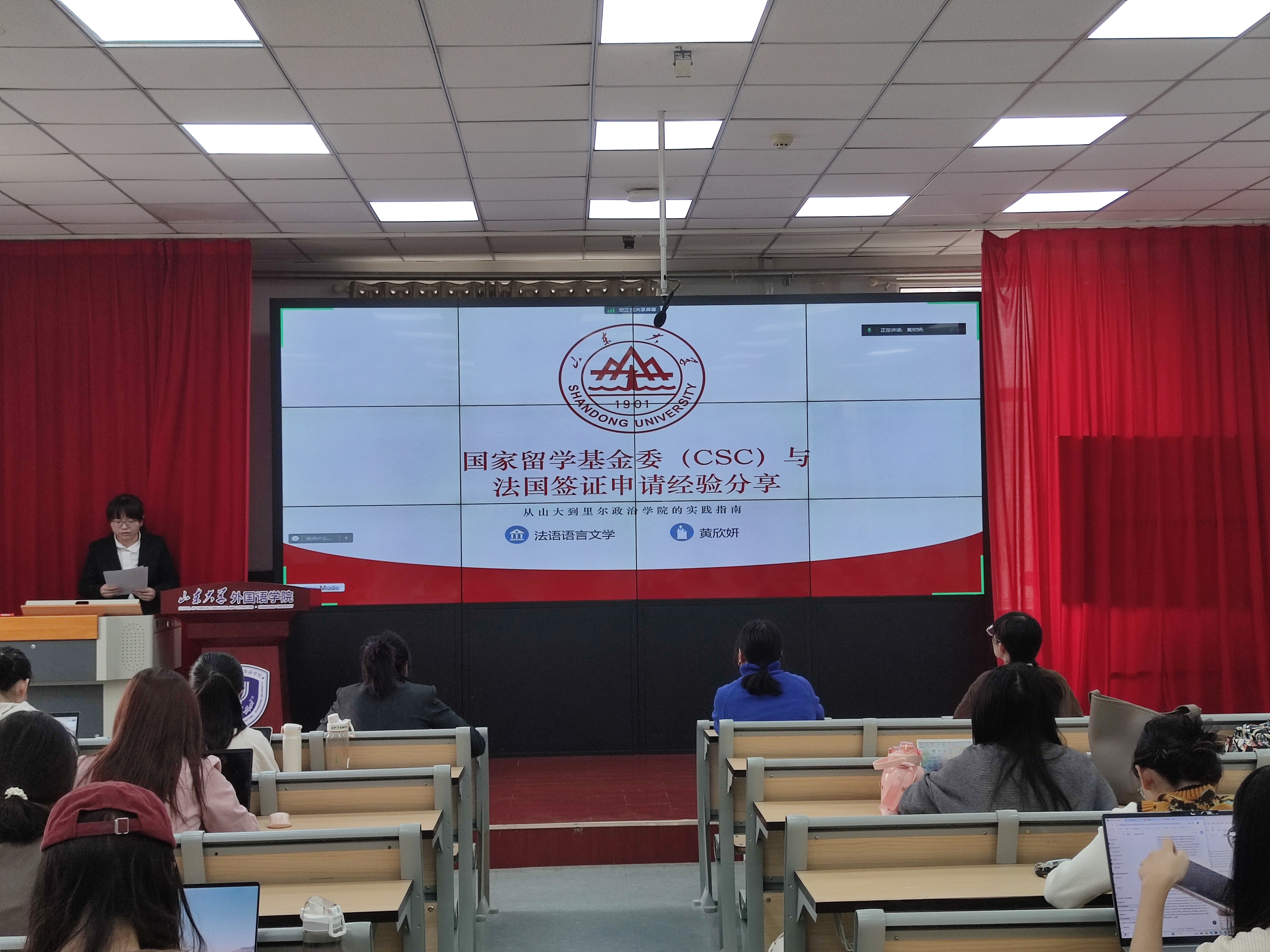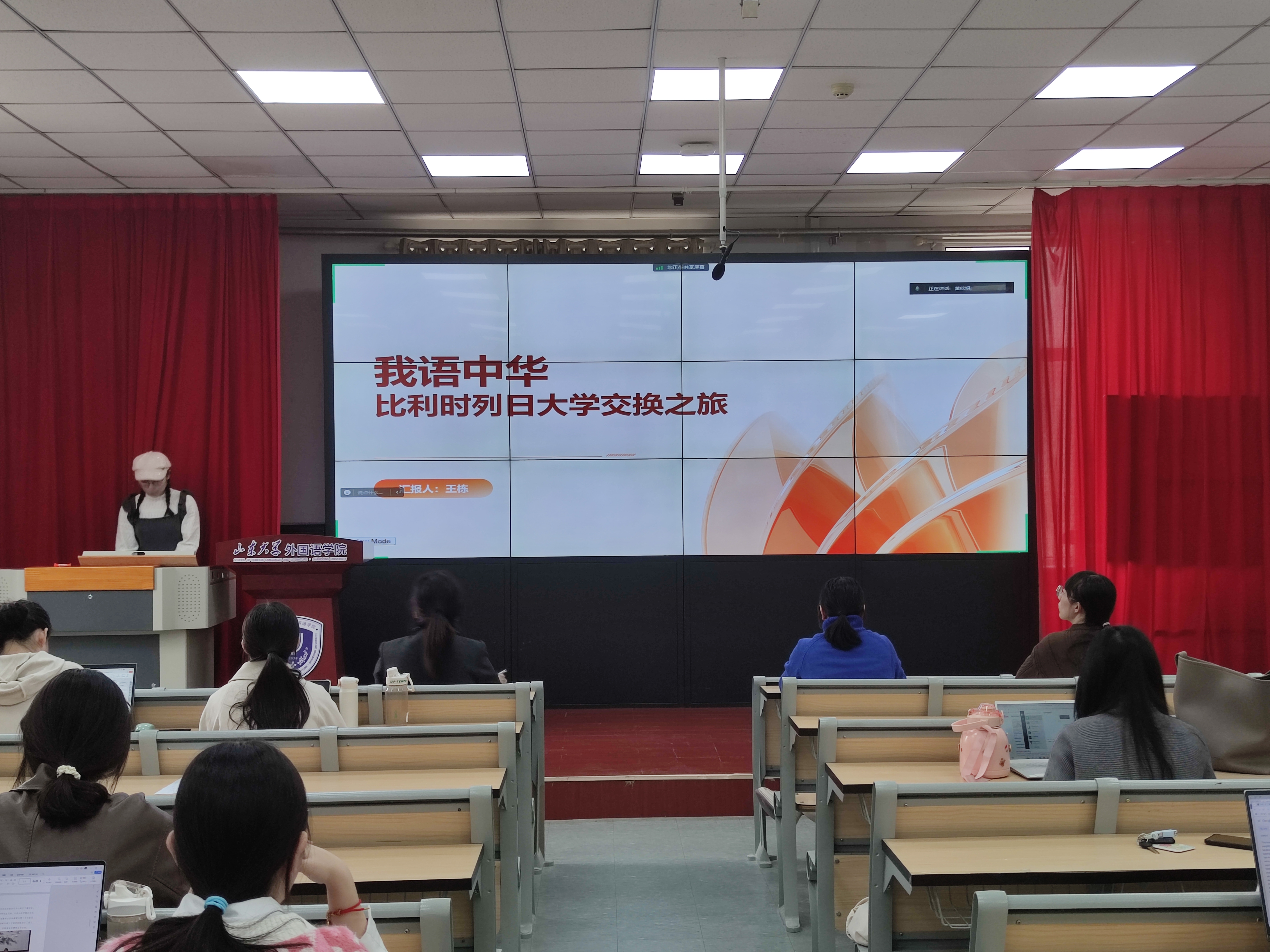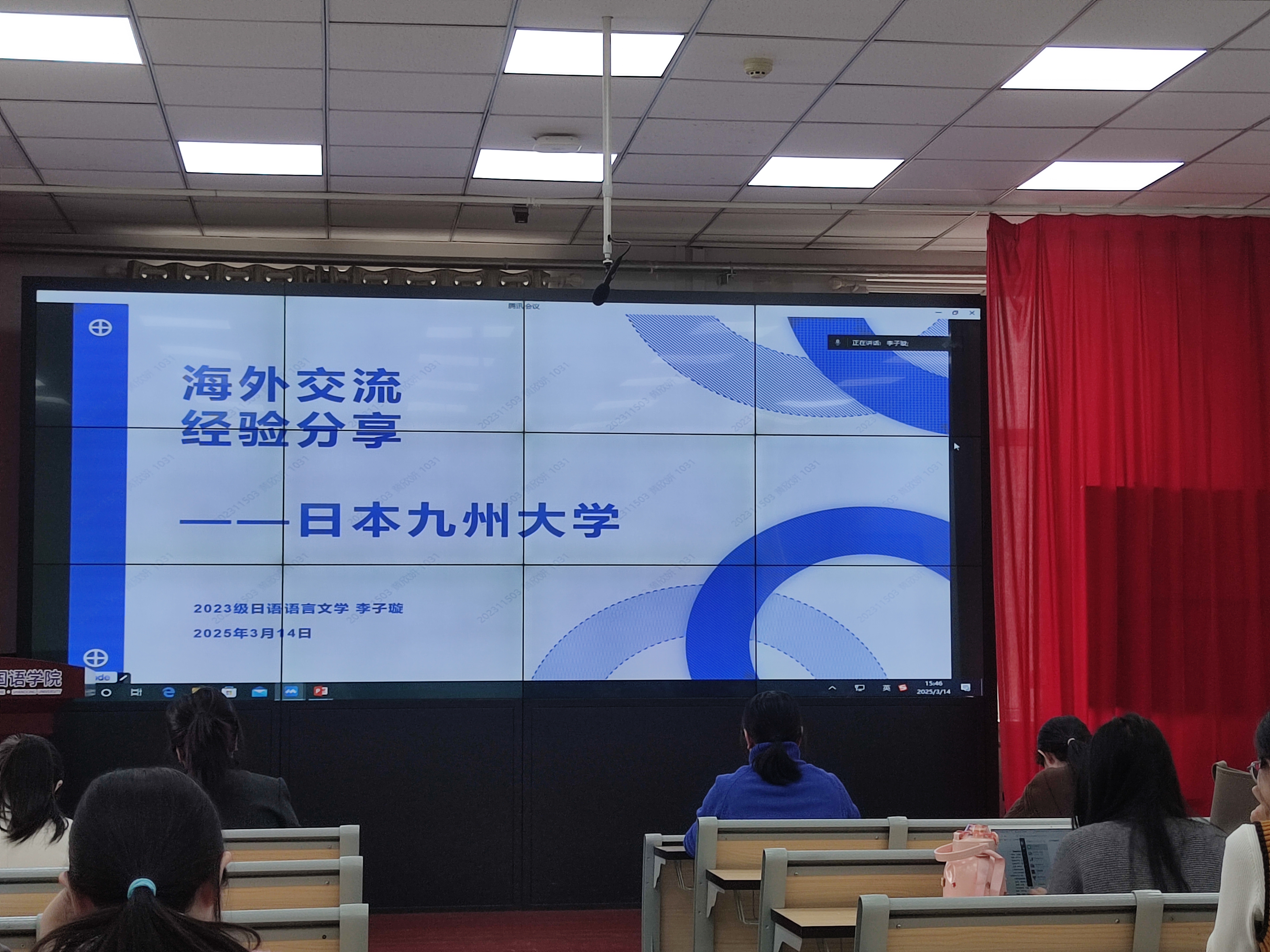 黄欣妍、徐晨晓、郑桂哲、王栋、李子璇五位同学分享自己的海外交流经验和学习生活体会。黄欣妍围绕申请国家留学基金委项目及法国签证的分享经验,她提到,这次交换经历提升了自己多方面能力,也意识到这些能力是全球治理人才的重要素质。徐晨晓聚焦法国住宿与日常生活两大板块,为有留学意向的同学提供有效指引,建议出国前处理好牙齿问题、备好常用药,旅游时注意安全。郑桂哲就法国里尔政治学院的学习经历展开分享,介绍了纸质图书馆际互借、电子资源、工作坊和讲座等学术资源,并展示和分享了丰富的课程选项及选课经验。王栋分享了在比利时列日大学交换学习的经历,介绍了列日大学两个特色鲜明的校区、良好的学习与生活环境及活跃的课堂氛围,游历欧洲和兼职经历也让她对欧洲儿童教育和中华优秀传统文化传承有了新的思考。李子璇从学习生活体验、跨文化交流经历和经验与启示三个方面分享她在日本九州大学的交流经验,她表示,在跨文化交流中,要保持文化自信,坚持辩证的观点,将经验付诸实践,取长补短。