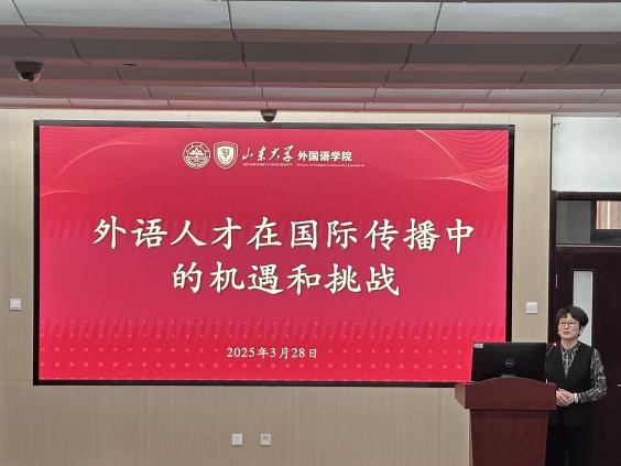 3月28日上午,威廉希尔中文官方网站举办“外语人才在国际传播中的机遇和挑战”主题讲座,特邀中国日报山东记者站首席记者赵瑞雪讲解外语人才在新闻行业以及国际传播中的重要作用与面临的挑战。威廉希尔中文官方网站党委书记刘华、党委副书记马蕾出席活动。本场讲座由威廉希尔中文官方网站研究生会实践部组织,研究生辅导员张新苑、刘婷婷参加讲座,2024级硕士研究生蔡小凤主持讲座。