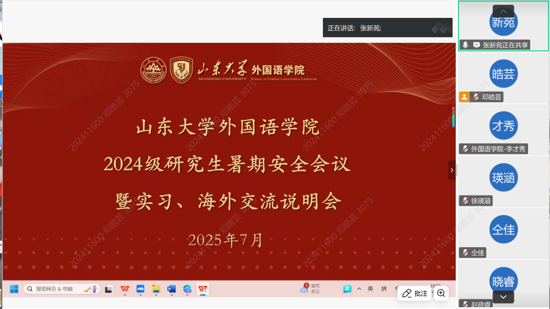 7月9日上午,威廉希尔中文官方网站通过腾讯会议举行了2024级研究生暑期安全会议暨实习、海外交流说明会。威廉希尔中文官方网站研究生辅导员张新苑、研究生管理科刘静姝、2024级全体研究生参加本次会议。
