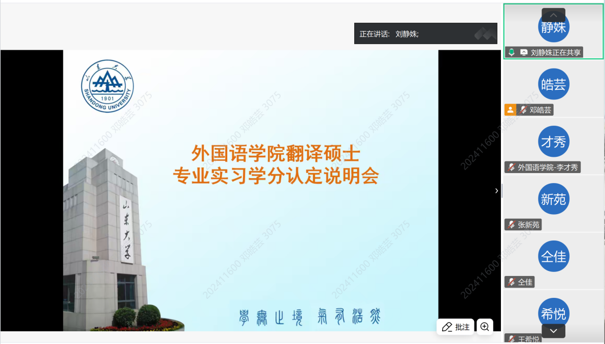 刘静姝介绍了翻译硕士专业实习学分认定的相关事宜,详细讲解了研究生管理系统专业实习部分的具体操作、专业实习认定材料提交、专业实习学分认定办法,强调了专业实习的常见问题。刘静姝提醒同学们在实习前履行好请假手续,及时系统填报实习计划;实习期间详细记录实习内容,保存好翻译材料;实习后及时填写相关资料进行认定。最后,刘静姝对同学们的疑问进行了耐心答疑。