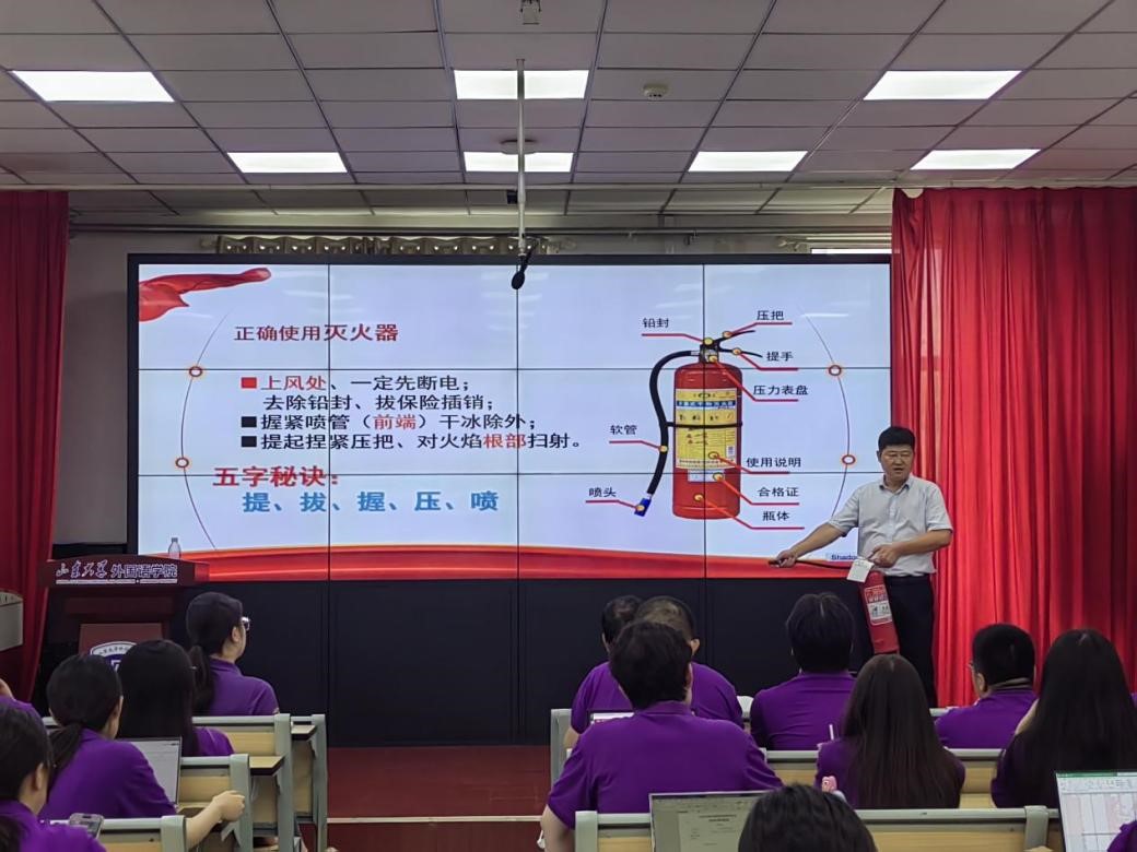 接着,董部长着重讲解了消防安全和诈骗防范两个重点。他提醒同学们要特别注意日常用火用电的安全,避免因用电不当引发火灾,威胁到生命财产安全。同时,他还现场示范了灭火器的使用方法,并通过“五字秘诀”帮助大家掌握紧急情况下的关键操作。