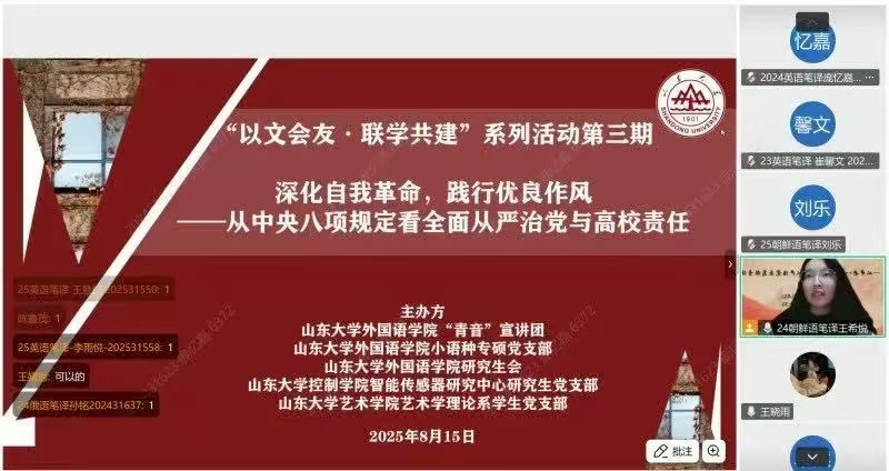8月15日,以“深化自我革命,践行优良作风——从中央八项规定看全面从严治党与高校责任”为主题的宣讲会顺利开展。此次宣讲会深入解读了中央八项规定精神,结合高校实际探讨作风建设,现场互动问答环节气氛热烈,师生们围绕相关问题展开深入讨论,深化了对全面从严治党的理解,为营造风清气正的校园环境筑牢思想根基。