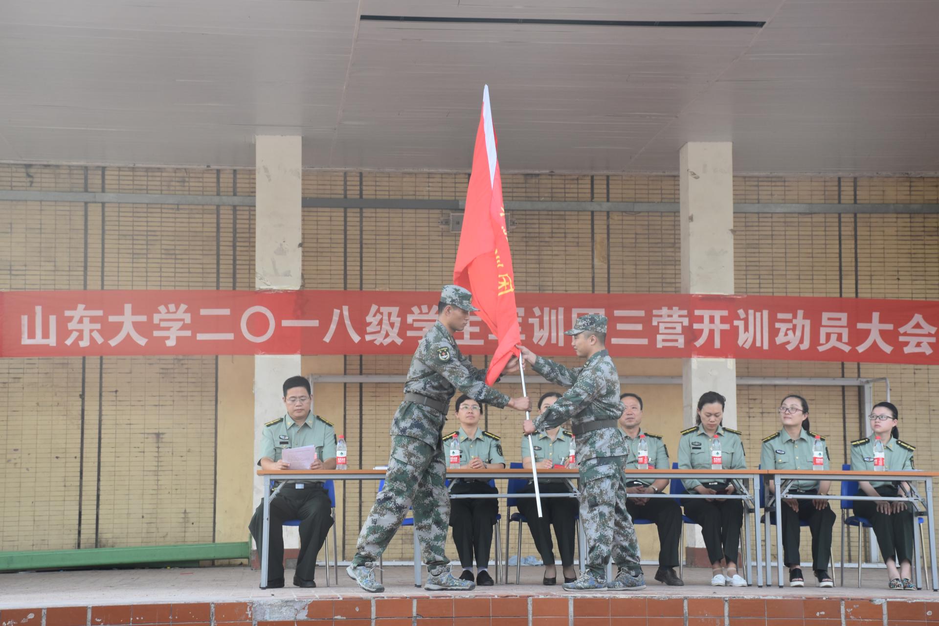 大会开始之后,全体参会成员起立,奏唱国歌。随后,军训团副政委傅艺娜宣读了三营连级干部任命决定。宣读完毕,三营营长马昊向各连授连旗,各连连长依次上台,从营长手中接过连旗,并向台下挥旗致意。