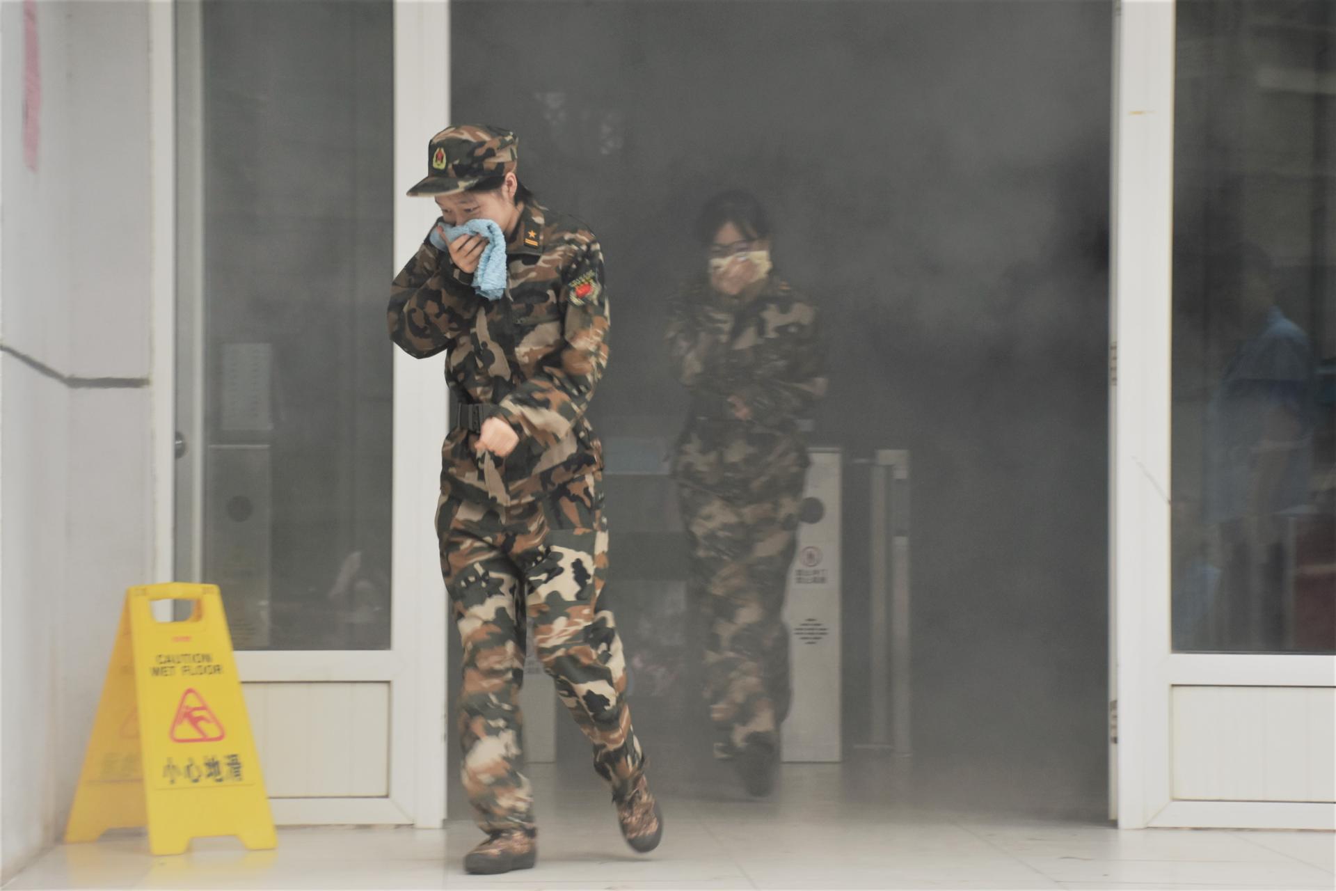 演习开始后,平静的宿舍楼中突然出现了滚滚浓烟并不断扩散,浓烟触发了楼道里的火灾报警设施。学员们在听到尖锐的报警声之后迅速找到了毛巾,将其弄湿,捂住口鼻,按顺序俯身前进,快速撤离了宿舍楼,来到了指定地点按队列集合。整个撤离过程迅速、有序。