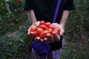 接着团队成员进行圣女果采摘体验。因为已过销售旺季,价格走势下跌,因此决定在这最后一批圣女果采摘完后进行闷棚处理。据村民介绍,采摘圣女果时,要尽量挑选那些色泽均匀鲜亮、果实圆正的圣女果,并且要用手从果柄基部采摘,这是为了不让果实受到损伤。
