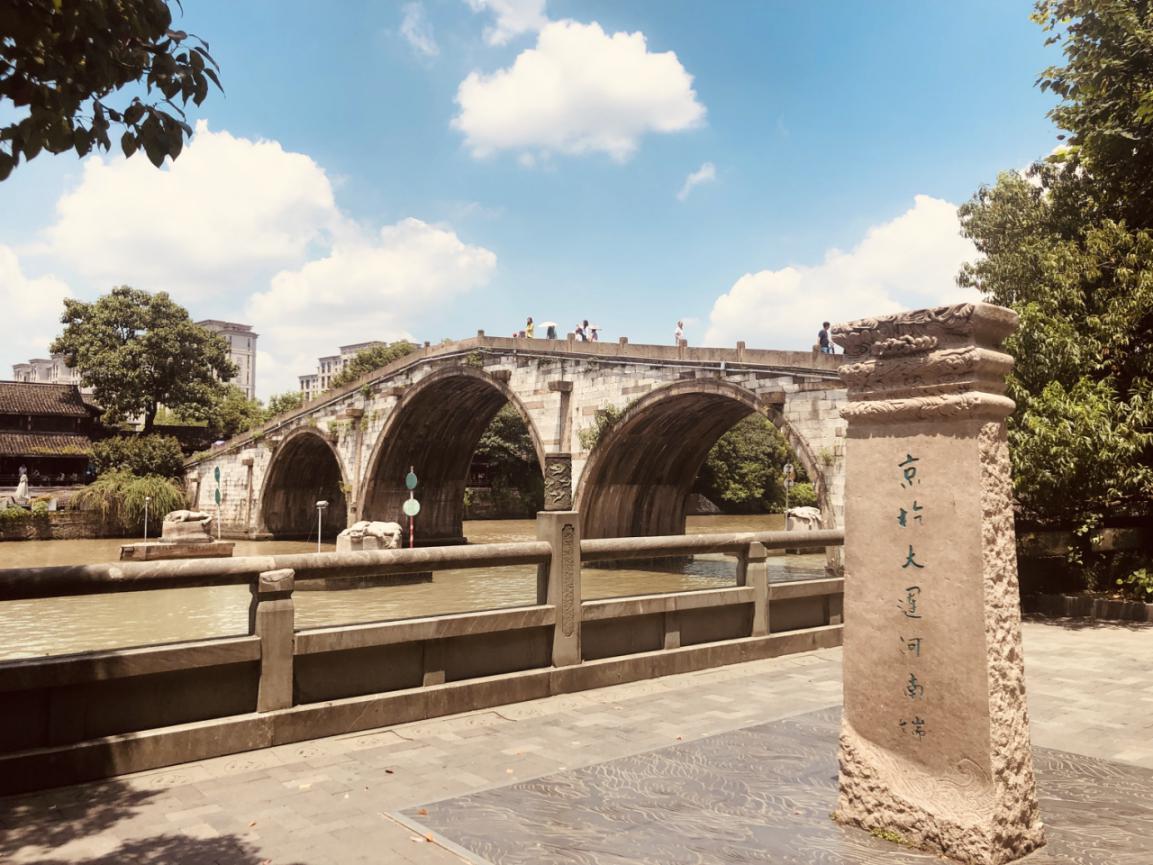 随后,团队成员前往参观了京杭大运河南端终点标志性建筑——拱宸桥。桥的两岸,清末黑瓦白墙的古建筑依然保存完好;运河之上,不时有几艘白色的游船载着慕名前来的游客领略运河风光,也有载着建筑材料的货船快速驶过。在拱宸桥附近的运河文化广场,团队成员更加深刻地感受到了古运河今日的生机勃勃,以及古运河与现代文明交融的独特魅力。