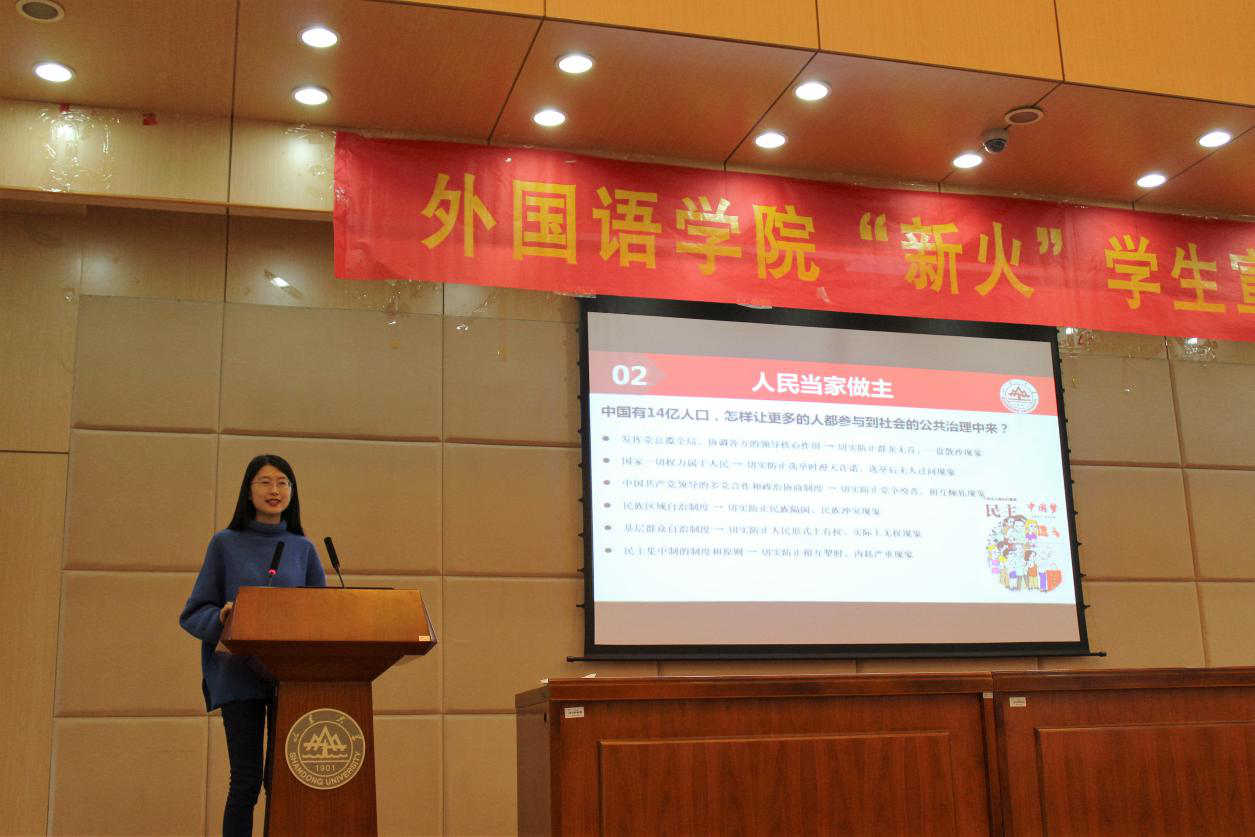 本次宣讲中“新火”宣讲团成员丁嘉琪、张俊晴、马文啸与林佳慧、孙焕然、金也琪组成两支队伍,先后为2019级全体学生,2018级全体学生2016级、2017级全体党员、预备党员、班委阐释了中国共产党的自身建设、人民当家作主的内涵、构建命运与共的美好世界这三个主题。