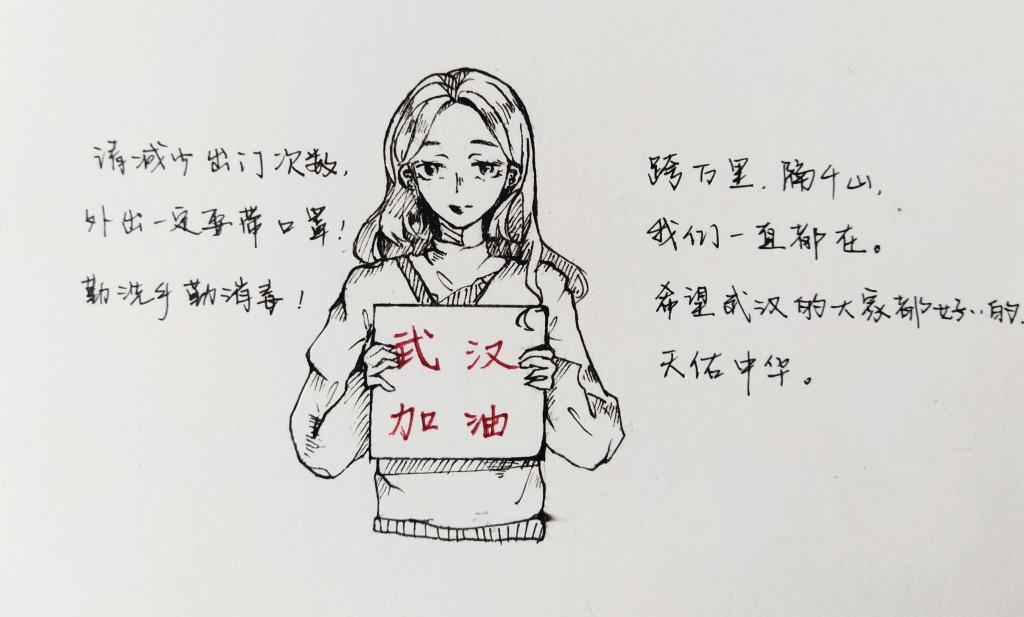 外院学子用捐款、绘画、书法、诗歌等方式纷纷为疫区受灾人民送去祝福。“跨万里,隔千山,我们一直都在”、“人心齐,病毒移”的口号激扬有力,振奋人心;“辽辽大地作肩脊,泱泱万民鼎力之,万望亟驱灾,万望长安康”、“勠力同心弃疾平祸乱,众志成城去病保平安”,慷慨激昂的诗作表达了外院学子对武汉疫情防护战的支持,对华夏渡过此难关的信心。2019级朝鲜语班何栩漾通过公众号“白岛岩心”参与开展“心灵防疫站”计划,发布暖心文章,呐喊加油口号,并努力与在此次疫情阻击战中备受煎熬的武汉各高校学生取得联系,进行心灵疏导;2016级翻译班韩雨真编译新闻《德国联邦外贸协会主席谈肺炎疫情:中国理应获得尊重和支持》,在人民日报英文客户端上发布;外院学子积极转发相关信息,配合学校工作,在家做好隔离防疫措施,并密切关注相关新闻,关心疫区人民安危;不仅如此,外院学子积极捐款捐物,通过各种渠道向武汉市慈善总会、鄂州市慈善总会、北京韩红爱心慈善基金会以及武汉前线等进行捐款,以班级和个人的形式为武汉提供支援、贡献力量。
