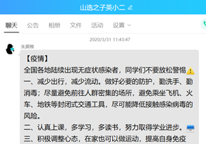 威廉希尔中文官方网站各团支部及时学习疫情防控知识,了解疫情最新动态,关注疫情发展趋势。其中,2019级英语二班团支部每日在班级群内进行疫情相关消息的通告,并且对于疫情、病毒等有关问题及时进行答疑,对于谣言及时辟谣;2018级法英国际组织班团支部每天将疫情最新情况转发至支部交流群,以帮助支部成员及时了解疫情真实发展动态;2018级英语一班全体班委负责在群里转发权威性的有关科普肺炎相关知识的微信推文、微博热搜等并使同学在了解新型冠状病毒肺炎的同时掌握一定的自我防范措施,掌握正确的佩戴口罩的方法;2019级俄语团支部每日将疫情最新情况转发到班群,并每日转发至少一篇科普文章到班群,让团支部成员提高疫情防控能力,减少不实信息对个人利益的损害。