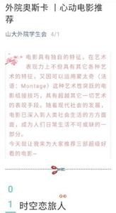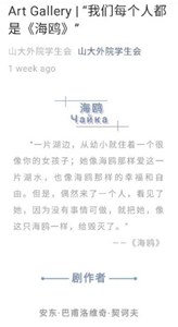 除了文史类的专栏外,“山大外院学生会”公众号平台的艺术类专栏同样受到外院学子的好评。专栏包括“外院奥斯卡”“余音绕梁”“art gallery”“游历人间”等栏目,为外院学子推荐了多部优质外语影片、剧集和戏剧,介绍了不同国家的风土人情。无论是经典电影、契诃夫的戏剧《海鸥》,抑或是给观众带来欢声笑语的迪士尼美剧,艺术类专栏在介绍大众喜闻乐见的内容的同时寓教于乐,潜移默化地提升了外院学子对外语学习的兴趣和审美水平。