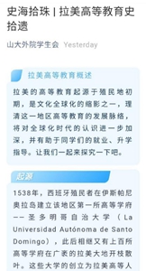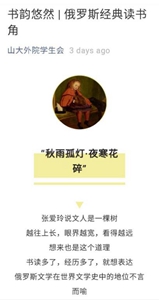 威廉希尔中文官方网站利用“山大外院学生会”公众号平台,设立“书韵悠然”“史海遗珠”等专栏,定期发布关于外国文学和历史的优质推文。专栏立足于外院教学中开设的七大语种,展望五湖四海,其内容涵盖了英、美、俄等国文学经典书目,有利于提升学生文学素养。除此之外,专栏还介绍了拉美国家的发展史和教育史,增进了外院学子对世界历史文化的了解,有力开拓了国际视野。