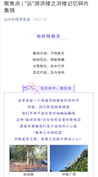 考虑到学生暂时无法返校,威廉希尔中文官方网站借阳春三月之际,开展“记忆中的洪楼”洪楼记忆征集活动,广泛征集外院学子手机相册中印象最深的洪楼照片和学子们笔下对洪楼最真挚的感情,通过微信推文的方式带领外院学子“云游”洪楼,领略洪楼四季之美,也能借此表达学生在疫情期间对洪楼的深切思念。