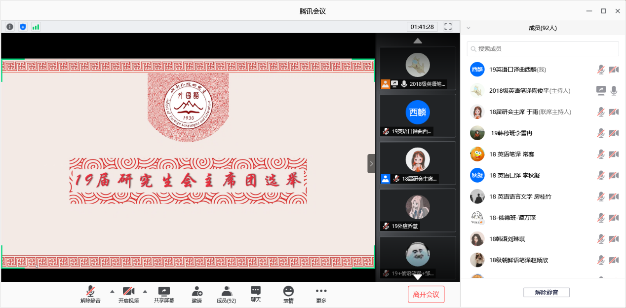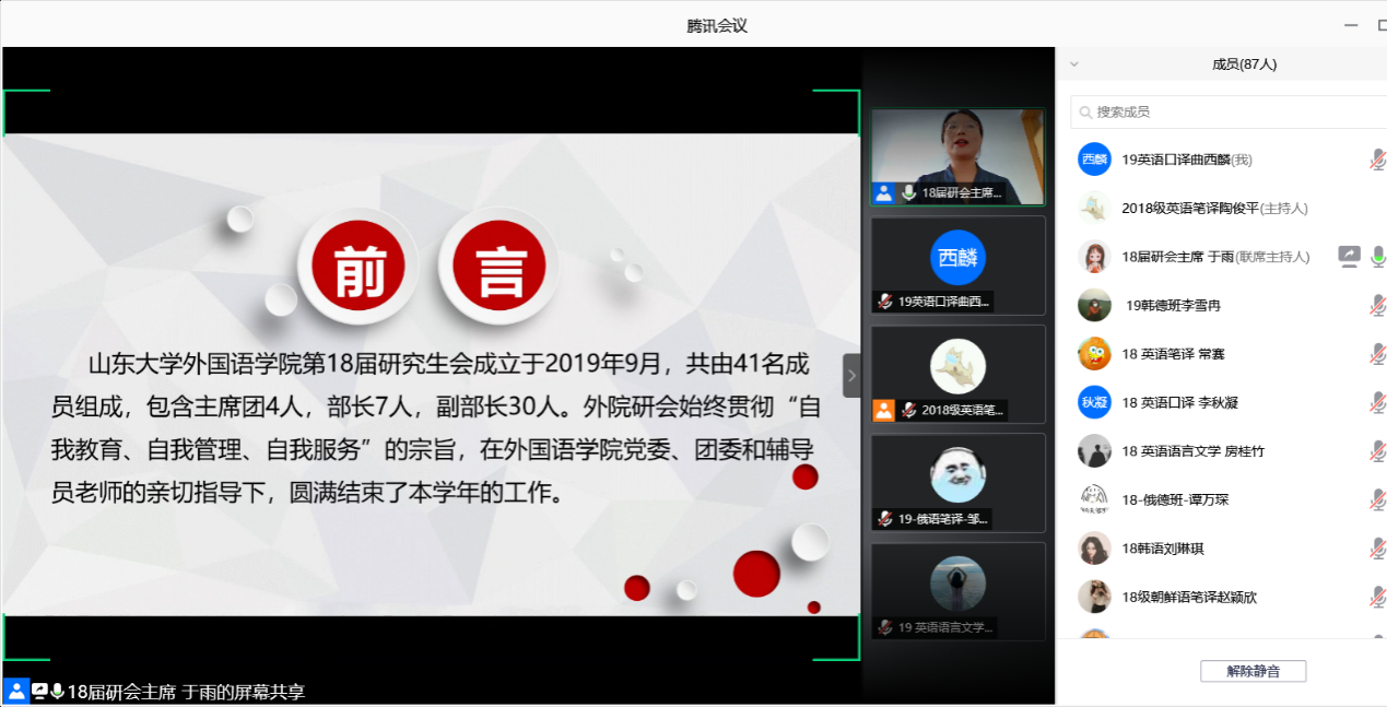 会议开始,由18届研究生会主席于雨进行工作报告,向大家汇报了2019-2020年度研究生会各部门所举办的主要活动,并表达了对第19届研究生会主席团候选人及新学年研会工作的美好祝愿。随后,申小宇、郝馨瑞、武官莹、袁敏、常阳、唐辰、李孟婷共7位主席团候选人分别通过腾讯会议进行了竞职演讲,在总结自己一年工作经验的基础上,提出了对未来工作的构想和计划,并表达了自己继续为同学们服务的强烈愿望。同学们根据候选人的竞职演讲及平日工作表现,投票选举产生了新一届主席团。会议最后,陶俊平对会议进行了总结,表达了对18届研究生会成员的感谢和对新一届主席团成员的祝贺,朱蕾老师寄语研究生会要增加学术性活动、强化活动的特色性、推进活动的外延性,并表示外院的各位领导和老师会一如既往的全力支持研究生会的工作。