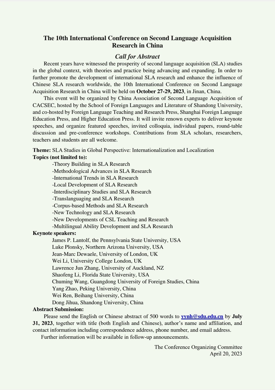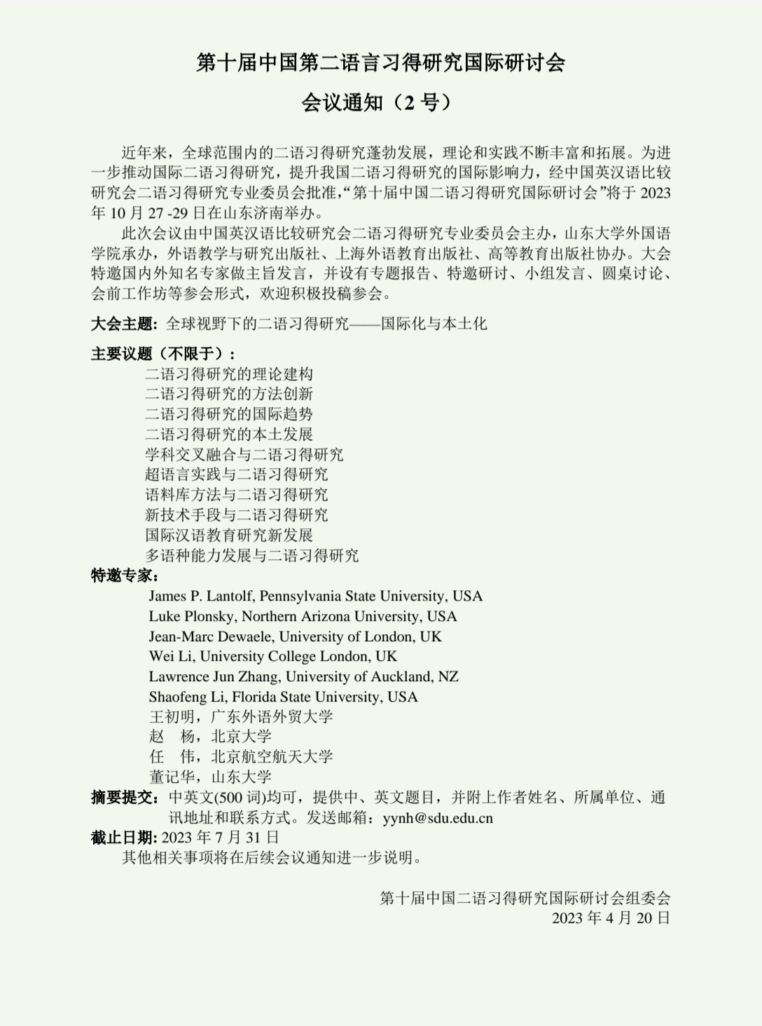 第十届中国第二语言习得研究国际研讨会会议通知(2号)