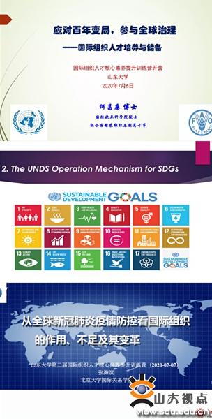 相比首届训练营,本次训练营的形式更加多样,内容更加丰富,并开创了“国际组织官员+学界知名学者+优秀青年代表”三位一体的授课模式。训练营邀请国际欧亚科学院院士、联合国粮农组织原副总干事何昌垂,国际劳工组织前高级官员、中国联合国协会前常务理事王纪元,北京大学国际关系学院副院长张海滨教授,亚洲开发银行驻华代表处长期顾问胡超逸,联合国贸发会议前高级官员Manuela Tortora,国际劳工组织前高级官员Alejandro Bonilla Garcia以及山大威廉希尔中文官方网站、政治学与公共管理学院、法学院等教师为学员授课。此外,训练营还特别安排了两次专题工作坊,创新性地以线上方式开展互动交流与真实场景的模拟演练,增强了训练营的趣味性和实战性。