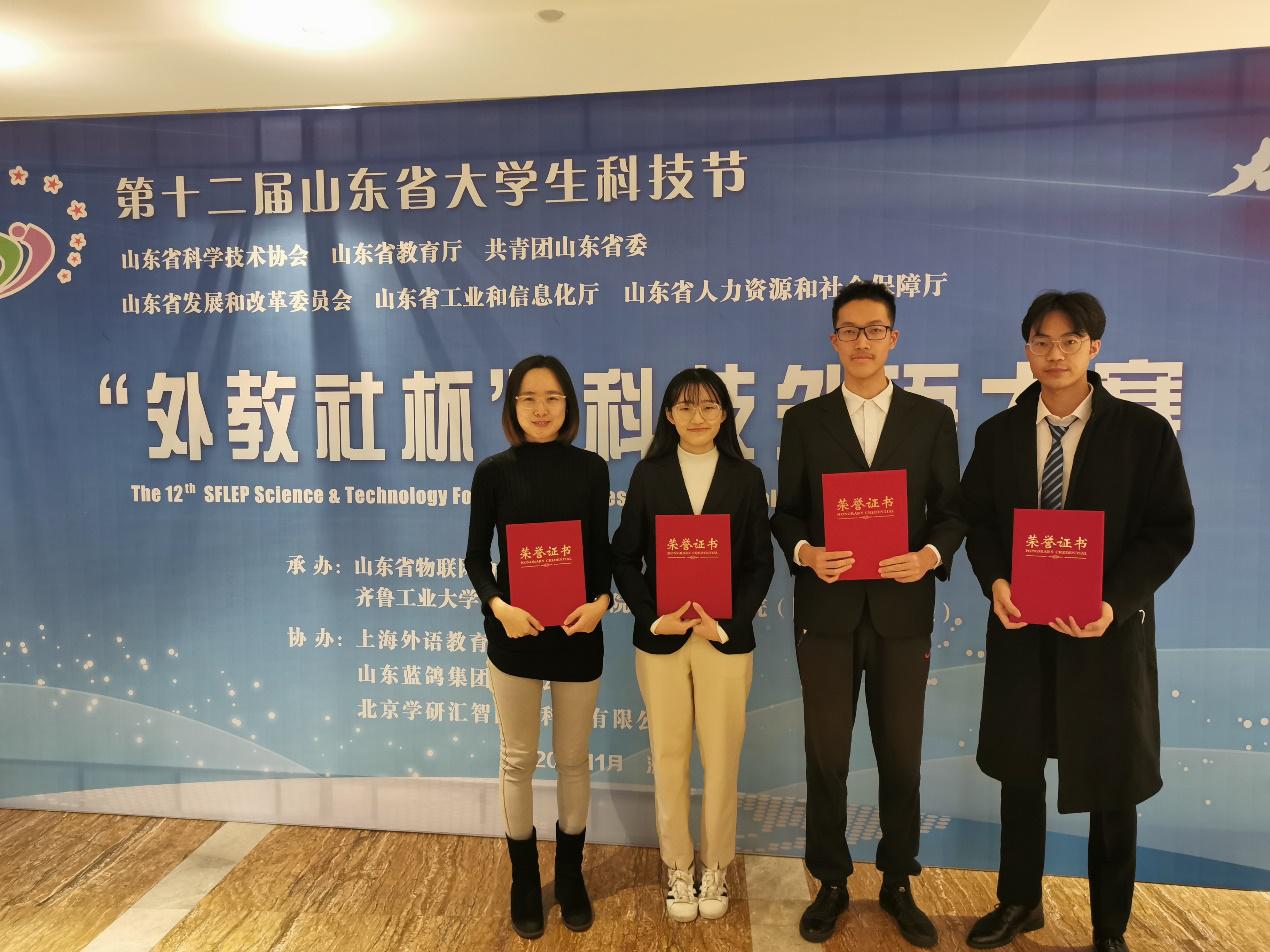 11月13日至14日,第十二届山东省大学生科技节“外教社杯”科技外语大赛在济南国际园博园酒店落下帷幕,威廉希尔官网研究生张祖政荣获英语专业研究生组省级一等奖,艺术学院研究生马京京荣获非英语专业研究生组省级二等奖,英法国际班牟笛荣获非英语专业本科生组省级二等奖、法英班王天翊荣获英语专业本科生组获得省级三等奖。