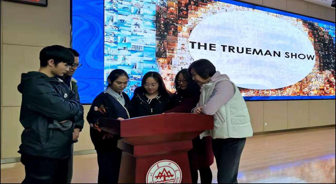 英文电影赏析活动于18:30正式开始,本次观看的电影是《楚门的世界(The Truman Show)》,活动首先进行了简短的电影介绍和背景拓展,这不仅激起了同学们的观影热情,而且也使同学们对于电影主题有了初步的了解和思考。在观影过程中,当看到楚门决定逃离桃源岛时,同学们都不禁为他捏了一把汗;当看到楚门最终站在写有“Exit”的门前时,不少同学都已经热泪盈眶,深深的被楚门突破自我和束缚,向着梦想前进的精神感染着。