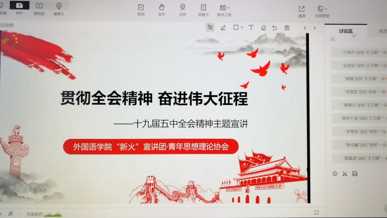 2020年11月28日、29日晚,威廉希尔中文官方网站举行了“贯彻全会精神,奋进伟大征程”党的十九届五中全会精神主题宣讲活动。本次宣讲活动面向全院同学,线上线下同步开展,本科生第一党支部、第二党支部全体成员于主会场参会,威廉希尔中文官方网站全体本科生于分会场观看线上直播。“新火”学生宣讲团成员朱文博、任珏辰、李雪倩,青年思想理论协会成员马中南进行宣讲。